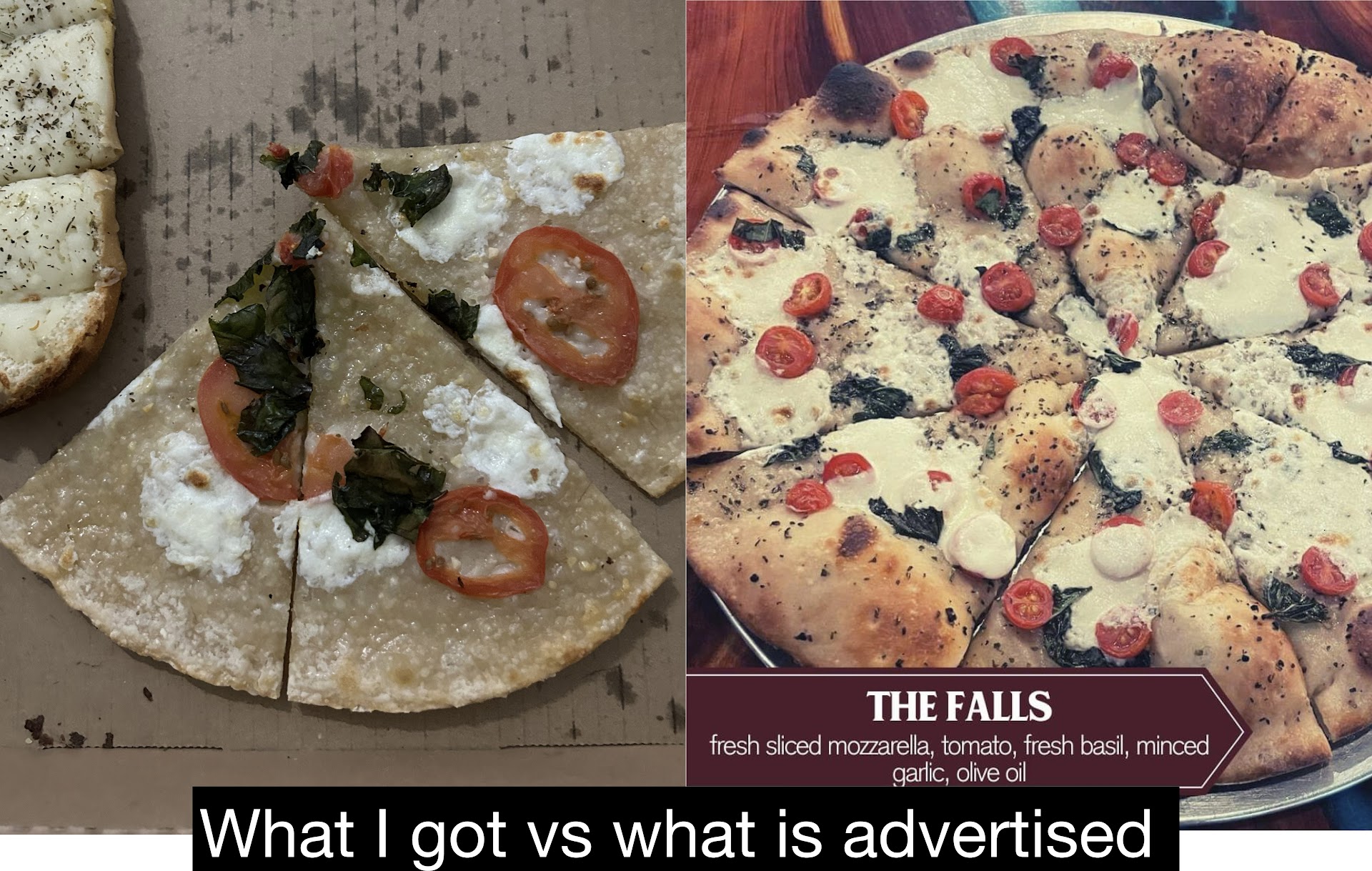 I will say the falls pizza I got was so sad lookingš„² Iāll put a photo of my to-go box along with the photo they use to advertise it lol.