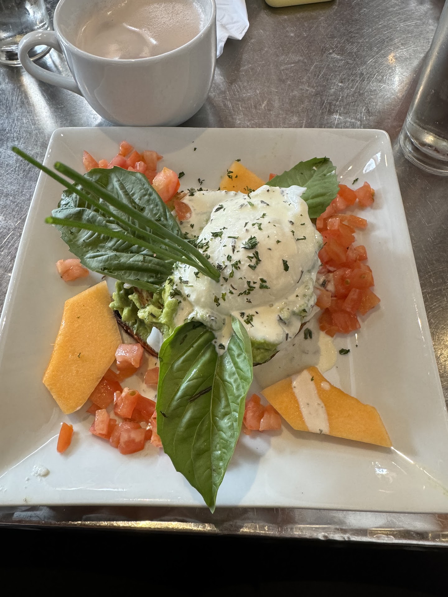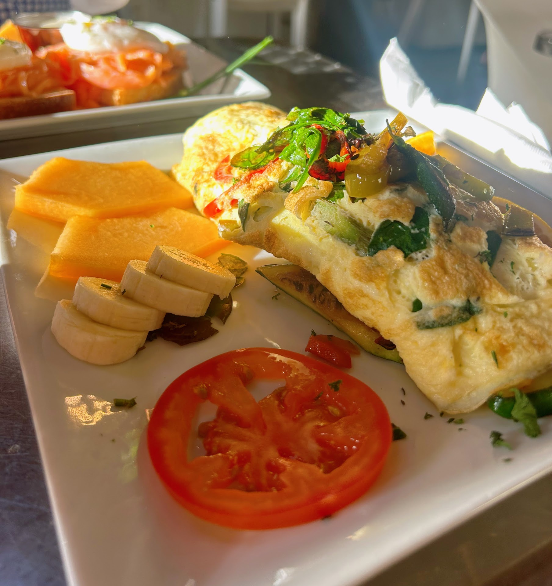 Accompanied by a colorful array of sides, including sweet cantaloupe and refreshing banana slices, the presentation was as inviting as the taste. The use of high-quality ingredients was evident, making this dish not only satisfying but also nutritious.