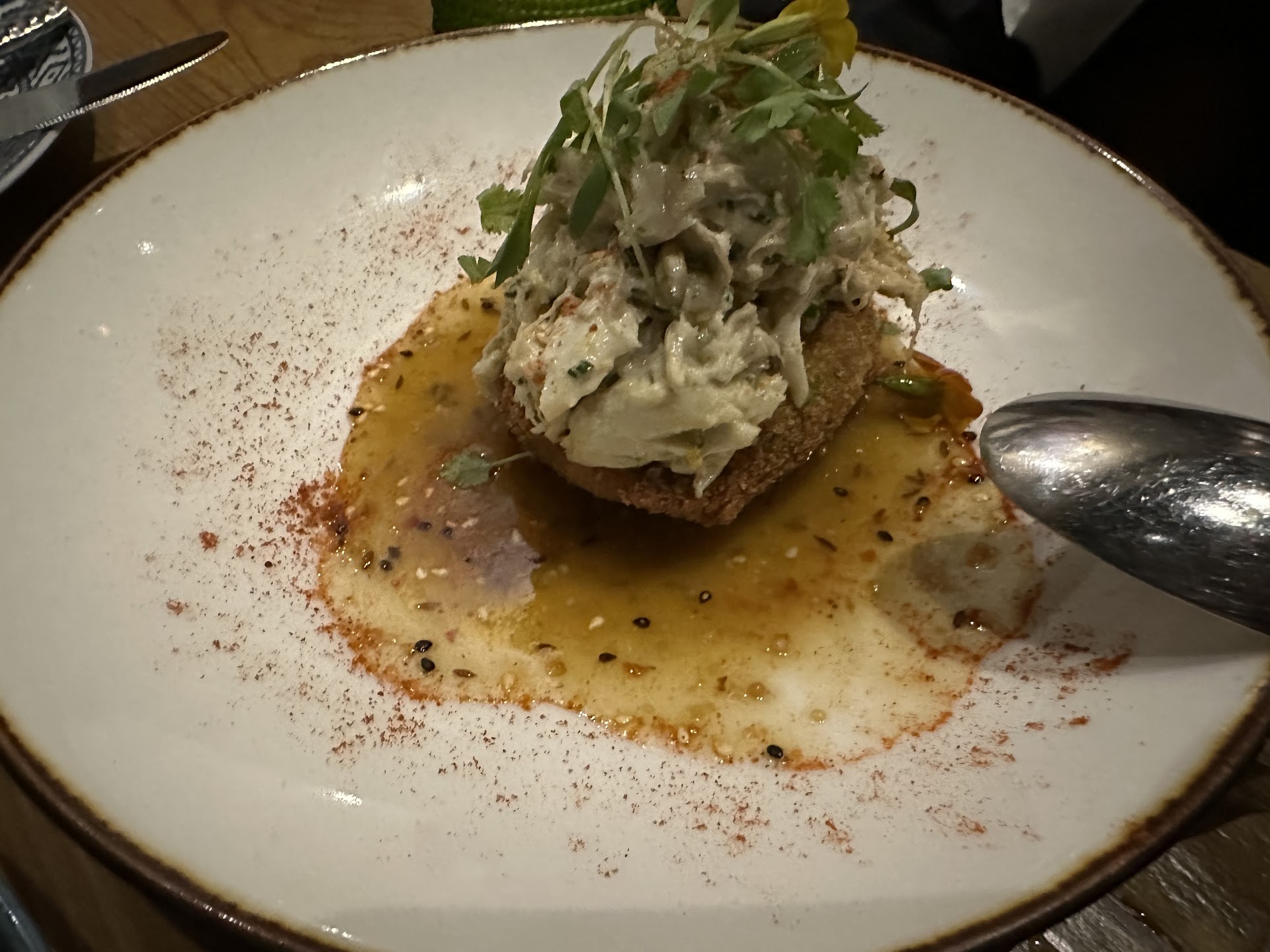 Read moreGreat service! Food was very good. The only plate that wasn’t very good was the bone marrow. It fell flat and was something we would skip. Avocado and crab salad was very tasty. Really like the crunchy fried avocado. The dressing worked really well with the dish, brought it all together. Pork belly was fantastic. Very crispy skin and perfect juicy meat with a good combination of fat to meat. It was very close to being perfectly cooked. This was probably my 2nd favorite crispy pork belly I’ve ever had (big thing for me, because I’ve enjoyed pork belly at hundreds of restaurants throughout Asia), right after my favorite pork belly in Bangkok, which is perfect every time. The only downside of this plate, not enough of it. Brussel sprouts were the best I’ve ever had in a restaurant. They were perfectly cooked and flavor had good balance without being overly salty. Liked the fact that the Chinese sausage was in it. These are almost as good as mine in my restaurant. One thing they did that gave it some really nice freshness is with adding cilantro, an idea Im going to steal. Really good side dish. For dessert, we had the Oh Beehive. Perfect ending to a very good meal. Very light and bright. Really liked the tame lemon flavor. Highly recommend. Didn’t have any drinks, usually don’t if it’s the first time at a place. Overall a very good meal. The only complaints were the bone marrow and possibly the service got a little slow at the end, which isn’t a big issue, just really liked the pace the rest of the meal went. Lamb shank was perfectly cooked and flavor...