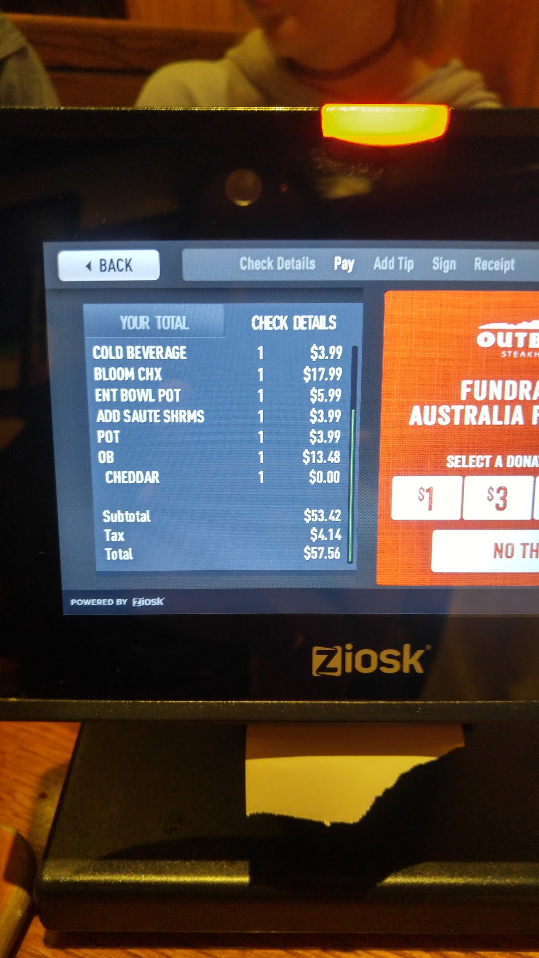 Read moreOutback used to be one of our favorite restaurants. My wife and I would eat there regularly and up until now never had a bad meal. Today was such a disappointment. I ordered a mixed drink and both me and my wife agreed they must have forgotten to add the alcohol. Basically is was an $8.00 glass of fruit punch served in a mini-mason jar. So after a few sips that one was gone and I foolishly ordered a second one to see if this time they remembered to add the alcohol. Nope. Just juice. The side salads used to be large. Today they brought a mini-version of what they used to serve. But no sweat, I come here for the steak. I order the 22oz. porterhouse steak cooked medium. I love the seasonings that they use as well as the grilled flavor. Not today. The steak was undercooked and it was noticeably thinner than usual. Instead of that dark brown grilled appearance it looked like it was fried and tasted like they forgot to add any seasonings. Heck, even the baked potato was half the size than it used to be. I have never left Outback still feeling hungry before, but not this time. I asked the waiter if they were changing things and he confirmed that since Outback was taken over by a corporation the quality has been degraded and many customers have expressed their complaints. What a shame. I am sure their corporate earnings will soar in the beginning making some business graduate look good. But soon the loyal customers will realize the changes and Outback will go the way of the Tasmanian...