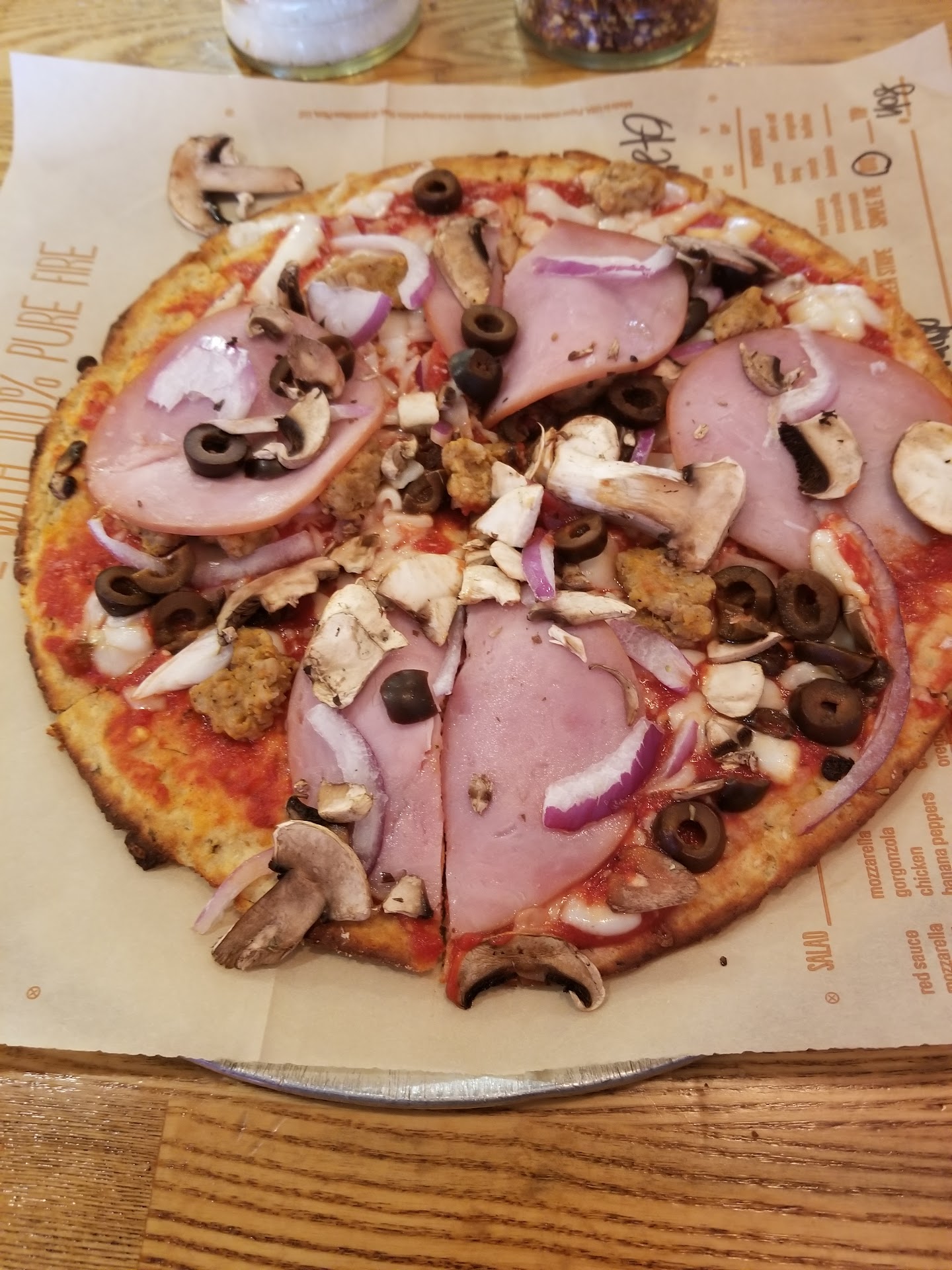 The pizza was done quick and it was tasty. The gluten free crust is thin like a cracker. My pizza was tasty and so were the other creations that came out along with my order. The last topping guy always has arugula and I always get that as a topping for my pizza to get it a zing. You should try it too.