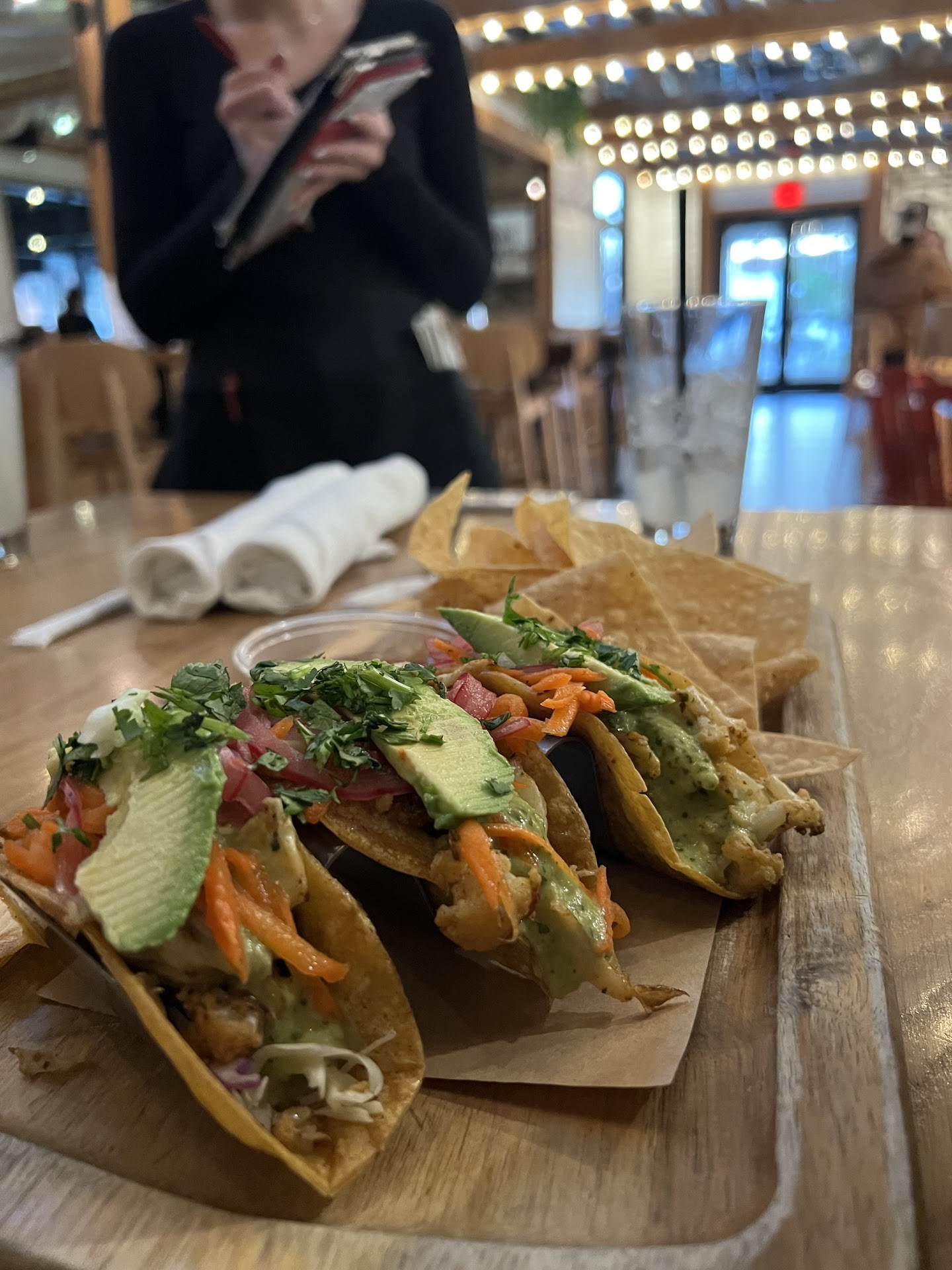 Went out for a late lunch with my friend and she picked WR Kitchen & Bar. All though i’ve heard of this place many times, i never stopped by before. I was pleasantly surprised to see vegan, gluten free, & vegetarian options. I ordered the cauliflower tacos (Vegetarian), and they were delicious! 9/10! I’m honestly craving them right now! My friend ordered the Crispy chicken sandwich, which i took a bite out of, and the chicken was amazing. It was so crunchy and tasty! 7/10! The tacos had so much flavor and you honestly couldn’t tell there was no meat, we were also given some garlic knots which i’d rate a 3/10. They smelled super good but tasted pretty bland, but if you dipped them in ranch or pico de gallo, they were super yummy! Lastly the mac n cheese was a 2/10, it was also a bit bland and more watery than a thick cheese consistency that you’d like to see in mac n cheese. The taste was a bit overpowering as it was one cheese taste, and for some reason it tasted a bit like blue cheese. I didn’t like it but my friend ended up eating some of it she would probably rate it a 3-4/10 as well. But overall the food was amazing, the service was great we were constantly checked on, and those tacos were chefs kiss! There a must have, even as an appetizer Overall i’d rate my experience a 7/10!