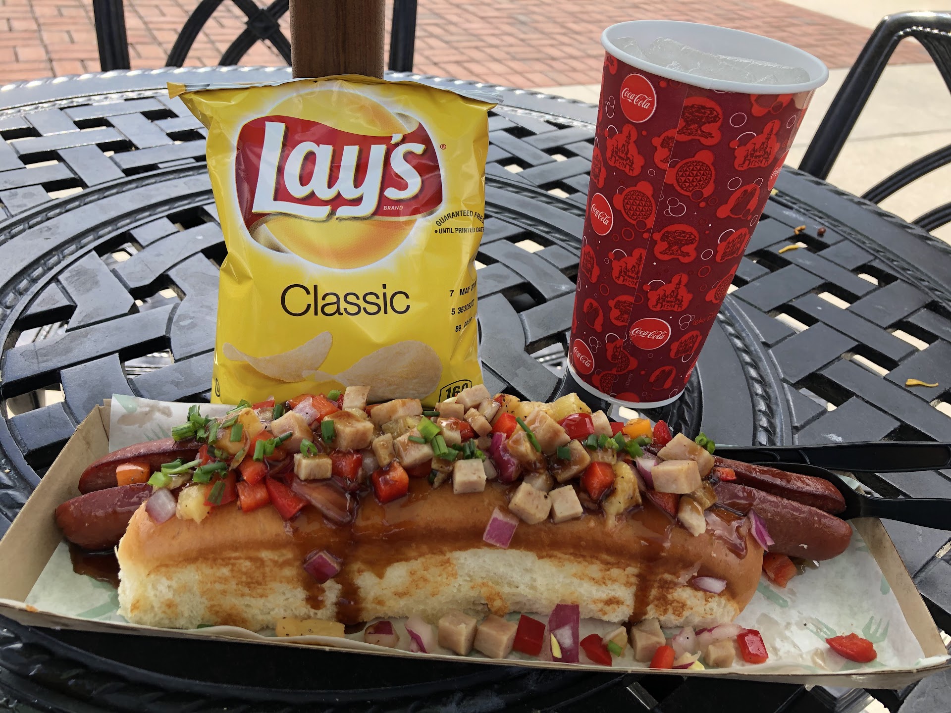 We've been walking by this one for quite some time and I have wanted to stop in to try something. I've read the menu in the past and new that it would be difficult for me to get anything that I could just eat as they make it but I was willing to try. I was there with my youngest at lunch time and we decided to check it out. There was no line and that was a bonus for us. They got the Hawaiian Island Dog while I took a chance on the Texas Chili Cheese Dog. Each one came with a bag of chips and we got a couple of bottles of water to go with them. There was just a short wait to get our order as they make them fresh. When they handed them to me I thought wow those are really big. I was glad I didn't get the footlong. They come on a very fresh roll that is fairly soft and yet firm enough to hold all the toppings along with the sausage. They pile them very high. Mine was an all beef hot dog with Texas style chili. The only part I was at all worried about was the chunks of tomato in it as I have to be careful eating tomato. To say this was a delicious chili dog would be a bit of an understatement. This was just about the best chili cheese dog I have ever had. Garnish in it on top of the chili and cheese or some crushed up Fritos corn chips. All the flavors worked very well together and I was very satisfied. My companions Hawaiian dog had fresh pineapple along with chunks of spam and onion. While the hot dog was nice and hot the toppings were somewhat chilled and they complemented each other very well. They were initially concerned about the spam on the hot dog but it added a nice touch and contrast to the onion and pineapple. I would say that I am definitely interested in trying some of the others but I will have to ask if they can customize the toppings a bit for me. This is a great little place with only a few outdoor tables. There are so many wonderful places to eat at Disney Springs and I hope to try all of them...