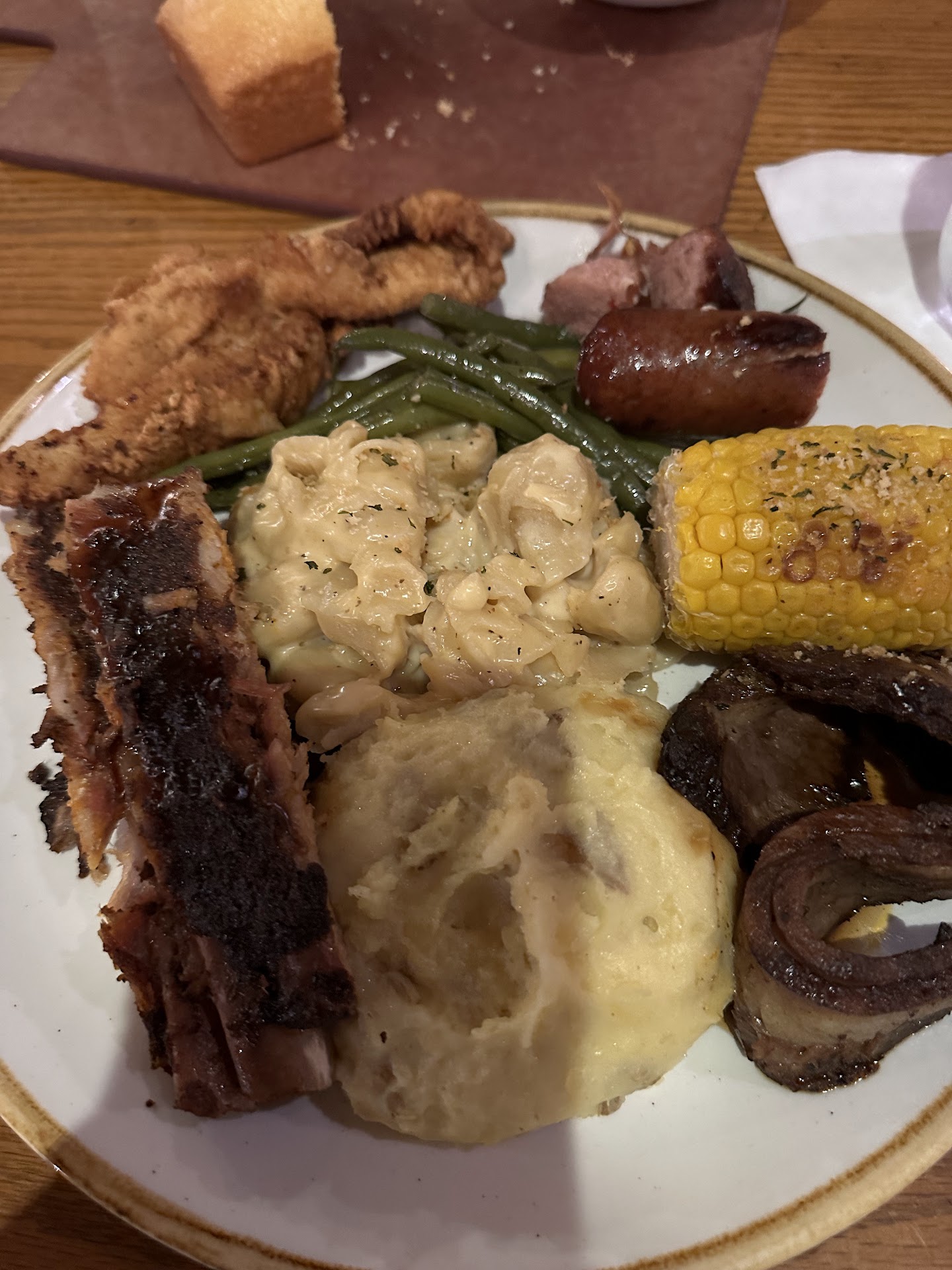 Read moreThis, my friends, was one of the best dining experiences my wife and I have had while eating at any of the Walt Disney World restaurants, ever, and that is saying a lot. For the past 30 years, we have eaten at just about every dining location on WDW property, including Disney Springs (formally known as Down Town Disney) locations. Except for Victoria & Albert's and the fancy restaurant on the top floor of the Contemporary Resort, we have visited every other place WDW has to offer. We were Annual Pass members for many years, and then we became Disney cast members during which i was awarded Disney's Partners In Excellence Award. We retired from Disney and are Silver Pass cast members who visit whenever we can. I only say all this because I know what great good Disney Customer Service should look like, and I know what "Great" Disney Customer Service looks like and I must say that our server "Justin" was one of the few Cast Members who goes above and beyond to provide Great Customer Service. I will just let you imagine all the extra effort he put in to provide us with such a great Disney dining experience because I watched him, and he was providing the same great customer service to all the other tables he was serving. I spoke with his manager and expressed our pleasure with his service, personality, and dedication to his profession. Now onto our meal, first to come out, after our drinks and water, was the house Corn Bread, prime rib medium rare, mine was blackened. Mashed potatoes with a little gravy. My wife had the green beans, and I had the collard greens. Now I am Southern all the way, so Collard Greens are not anything new, and I love them, but they had a little Louisiana sharpness to them that was a surprisingly well presented difference. The prime rib was very tender and delicious. The mashed potatoes were good and only enough served to accent the prime rib, the center of the dinner attention. Our dessert was the banana cheese cake. My wife fell in love with it and is now asking if I can find the recipe and fix it at home. You see, I am the one who does most of the cooking in our house. All during our meal, Justin, made several trips checking on us, refilling our water and beverages when needed, but at no time was he ever intrusive or overbearing to serve and please, it was all natural for him. The end of our meal came, and after paying our bill which already included a customary 18 % gratuity because of the cast member discount we were using, I gave him another good tip and thanked him for such excellent service and for going above and beyond to provide that Great Disney Customer Service. Keep up the great job, Justin.