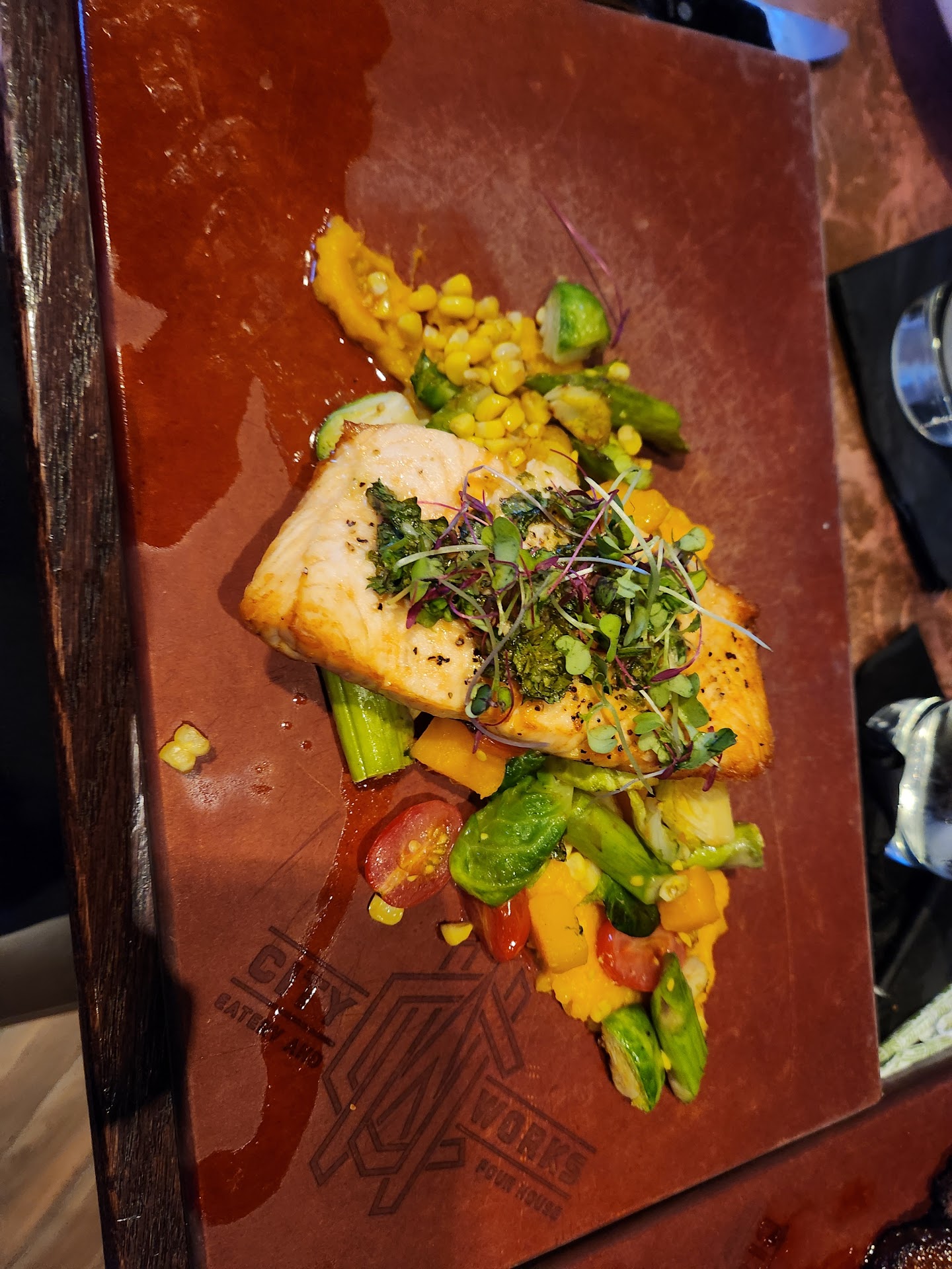 Read moreThis is the most mediocre experience I have had in a long time. Went there with my whole family, got drinks and appetizers. Drinks were probably one of the most flavorful parts of the night. The appetizers were just okay, nothing special (we got the pretzel bites and the fried pickles). When it came to food, we waited up to 40 minutes for the main entrees to come out. They only arrived when our server realized we had no food after a while. As for the food, there was a very confusing mix up. One of the members of our party had wanted to order the meatloaf but later came to the table and said they were "out" (at 6:15pm mind you). But when the food finally arrived, the meatloaf came with it and the server delivering the food was extremely confused when we informed him our server for the night had said they were "out". So now we had an extra dish, which wasn't necessary bad, but it meant it didn't really get eaten, which felt wasteful. And now we get to the food. I have never felt so sorry for a salmon to die in my life. The presentation was a lie to the experience I was about to have. It had no flavor, and was extremely dry. The vegetables it was served with had no seasoning. It said it came with "salsa verde" but only a few sad cilantro leaves were on top. As for the fingerling potatoes it came with? Three. Three undercooked sad little potatoes, couldn't hardly cut them with a knife. It was an extremely disappointing meal. My party members had a mix of responses to their dishes. One got the smoked Mac and cheese which didn't have any hint of smoke and wasn't very cheesy. The bacon cheeseburger was very dry and also had no flavor. The only thing that I tried off one of the members of the group that actually felt like a true culinary experience of flavors was the smoked meatloaf. Amazing. The staff were somewhat accommodating with the mixup with the entree dishes, and offered a small discount. Overall though, not worth coming back to. Save your money and go somewhere else. If you'd like to eat somewhere with flavor, you won't...