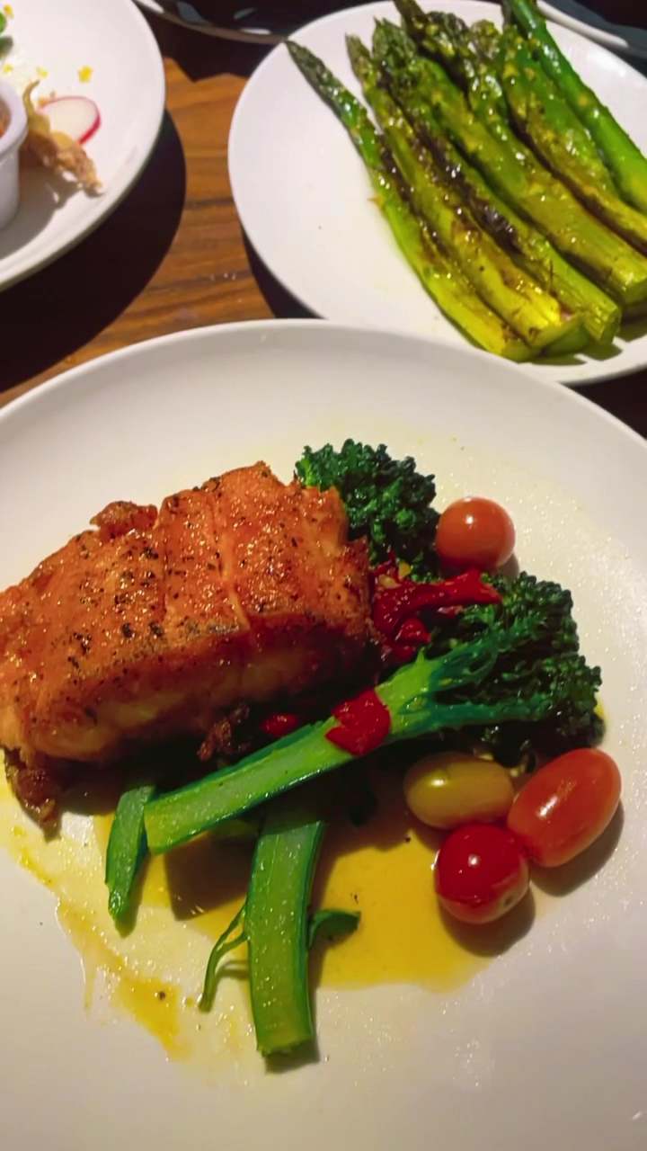 thinking of dining at STK? You better put your sneakers on! It was about a 10 min walk from the parking garage to the restaurant! It doesnât feel so bad as itâs real pretty but when youâre wearing your super cute high heels is definitely a walk! Itâs real pretty inside they have this super cute STK wall made of pink flowers! Perfect to take a few pics! Walking in they sat us at an awkward table! But the manager came by and moved us to a bigger much better table, where we could actually have some elbow room! The server that started us off was super charming and funny but then disappeared after taking our food ordered. I guess he went home and didnât tell us so some random lady took over. The food was delicious!! We got the calamari to start and I really liked it! It came with a sweet sauce to dip it. And they also brought bread to the table! The bread came with a weird green oil that looked funky to me so I didnât have any of it but the bread was really good by itself. I got the maple rubbed salmon priced at $55 as I wasnât in the mood for steak. Though I asked for no maple and the server said it would be no problem. It still came out with the maple flavor. I guess cause he knew he was leaving he didnât really care. But it was one of my girlfriends birthday so I didnât wanna say anything. I actually really enjoyed it so it was okay. The sides are priced at $20 each but they are rather large so you can share with the table! Out of the asparagus, mash potatoes and Mac and cheese, the Mac was my absolutely favorite! My girlfriends got a couple of drinks and they were tasty and strong! I am not drinking atm so I had Sheryl temple lol. I really wish the service was better though, random ladies kept coming up to our table and trying to take plates when they clearly still had food in it!!!! We were sharing and they kept taking our side plates and silverware!!! We literally had to eat with our fingers at one point! We asked them to please stop taking the plates specifically if there was food on it! As we were trying to enjoy our meal and chat with each other and celebrate the birthday girl! But nope they kept doing it! We asked for to go boxes and as we were trying to pack our food the same lady we had just told to please stop taking our plates with food in it came back to our table and started taking the plates we had yet to pack to take home!! I literally had to yell at the lady âstop!!! Weâre taking all of this home!!!â So she would put the plates down. The whole experience was very annoying! Like we are spending hundreds of dollars on food like please let us enjoy and take our time! They rushed our whole dinner!! Which was very disappointing! They ruined the whole vibe and atmosphere! There arenât many vegetarian options either! But The food was great came out quite fast and...