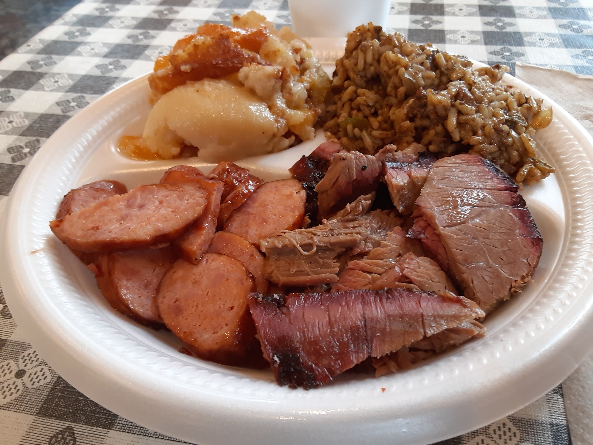 Read moreMy 341st 'cue stop in a 35 state odyssey brought me here for lunch. You order your meats first, and once you receive the plate, you move on to load up your chosen sides cafeteria style before finishing at the soda machine (coke products). A 2 meat (sausage, brisket), 2 sides (dirty rice, peach cobbler) plate with a diet coke ran a very reasonable $16.34. The chopped brisket proved lightly seasoned with a strong pink ring. The sausage was serviceable, the dirty rice terrific, and the peach cobbler surprisingly bland. If I was taking it home, I would add a spice to improve the flavor profile. The Texas toast is a nice touch. In sum, if you are in the neighborhood and hungry for 'cue, this is...