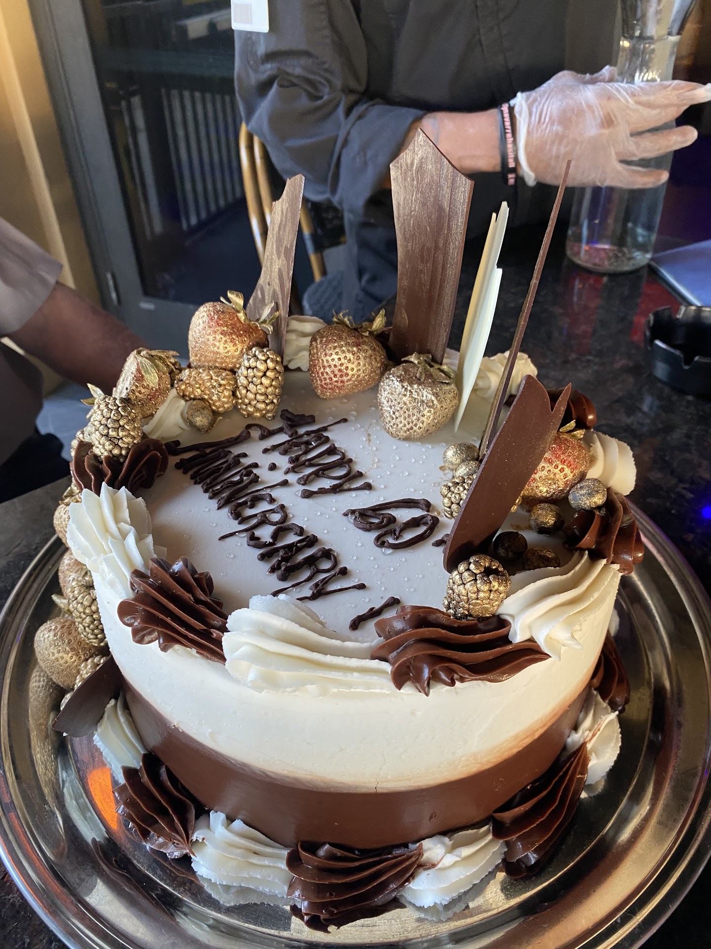 Dessert: Blue Martini Management with the help of the Golden Nugget Bakery, arranged for me the most amazing chocolate cake and it included “Happy 60th Wedding Anniversary”. It was brought out to our table by Blue Martini’s Head Chef and served to us.
