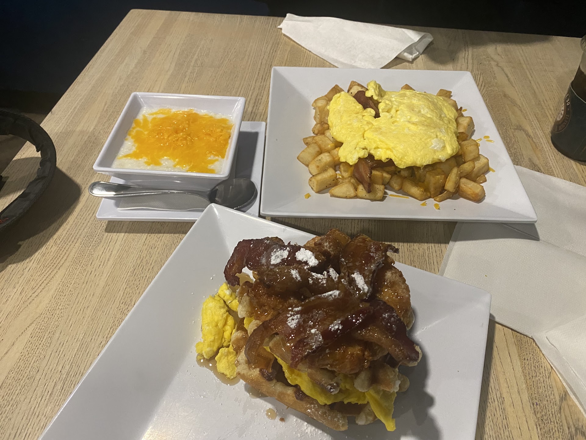 The chicken and waffles was amazeballs. The chicken was seasoned and the bacon was nice and thick. The waffles were great and Iām a pancake person.