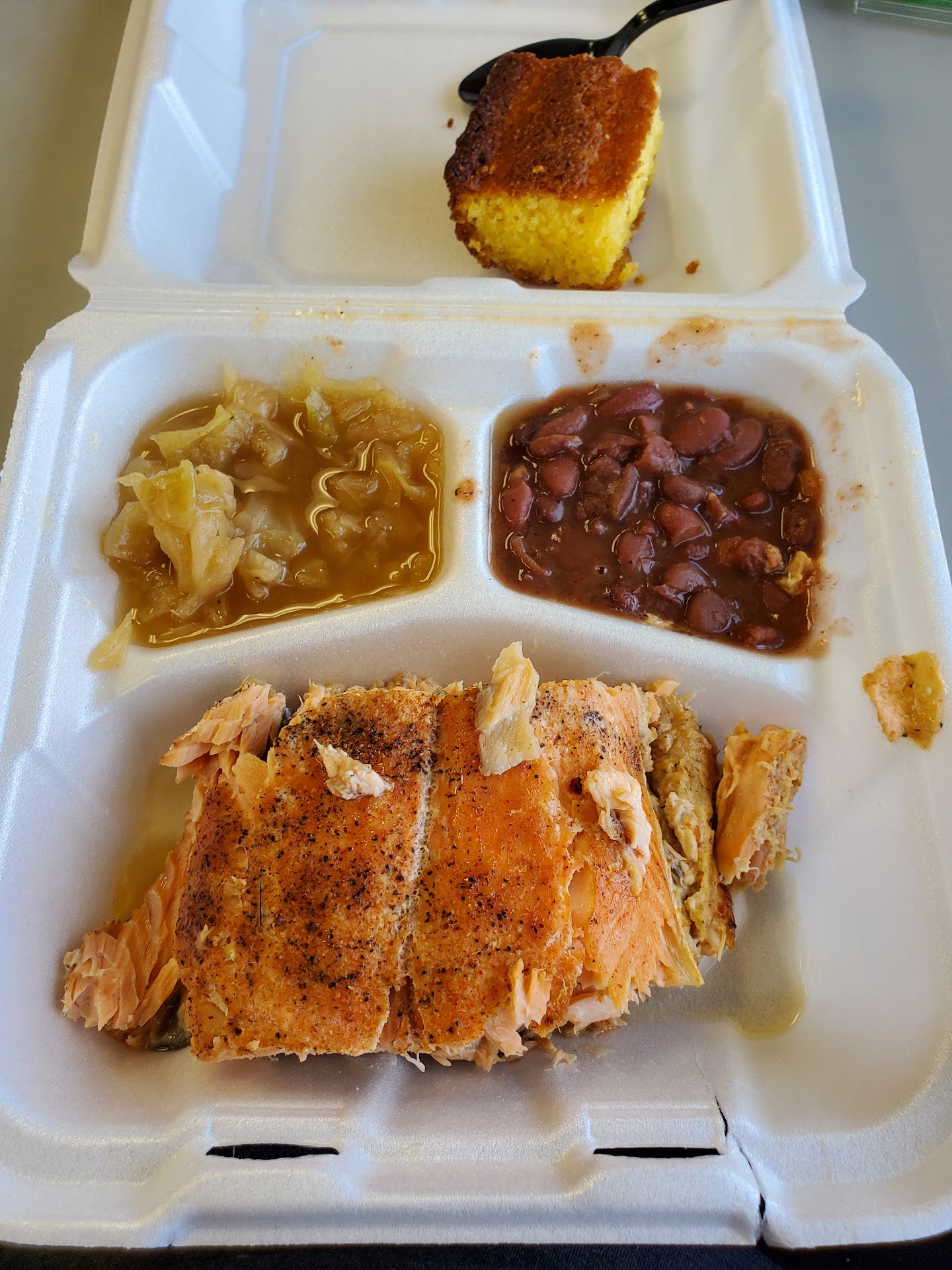 I ate here for the first time January 2022. My husband said the food was really good. I ordered lobster stuffed salmon with cabbage (an extra side of cabbage, which was 2.50 for a smidgen) and beans, cornbread came with it. The fish was ok, a bit dry though. Cabbage and and beans tasted like what I eat at home so it was nothing I've never had. That cornbread was really rich and buttery like cake. I didn't care for it. It was ok overall but I can eat the same thing at home and cook it how i like. Also got some of their red velvet and it was trash. I love red velvet cake but theirs had white, vanilla frosting and it's supposed to be cream cheese frosting. I didn't care for the excessive cake crumbs that was in the frosting, just a sloppy presentation. Maybe they frosted the...