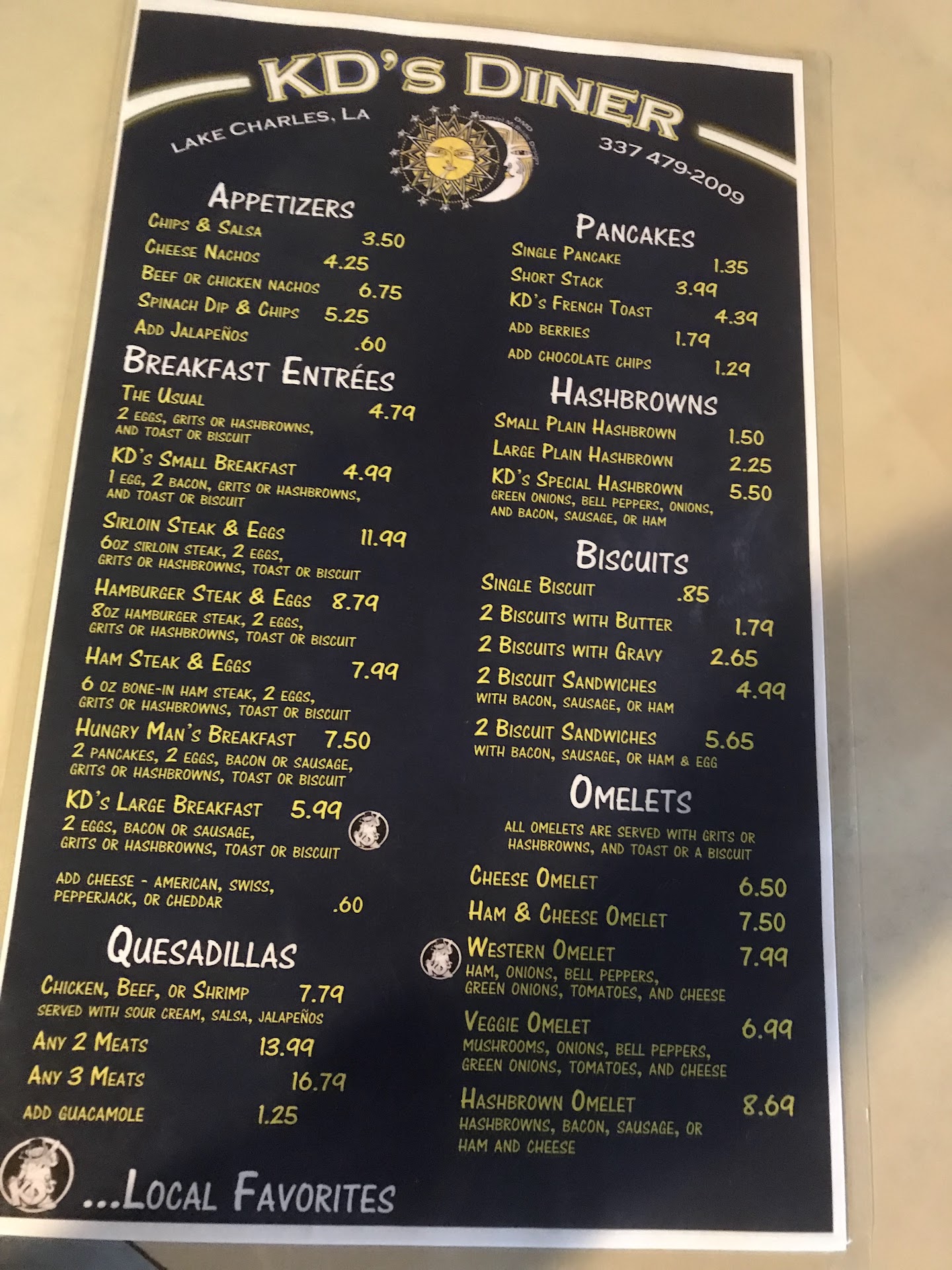 Read moreOn Wednesday 11/1/23, my husband and I chose to go to KD's for lunch with our family because of budget. We were in the Lake Charles area for an appointment, decided on KD's because the prices looked reasonable. When we arrived at the diner my husband and I walked in first, started sitting at the table nearest the door and the server who had no name tag and didn't identify herself rudely asked what we wanted to drink before we even sat down. I explained to her there were three others with us and we're waiting for them to come in. Now mind you, this is our first visit at this restaurant and it'll be our last. The server was RUDE, CRUDE, AND SOCIALLY UNEXCEPTABLE! My husband and I didn't order anything because of the money situation, so all we had was water and we let our family members order what they wanted. My daughter asked if they had onion rings, the server replied rudely they didn't have any. My family all ordered cheeseburgers, they asked for french fries and she rudely told them that they don't serve fries, only chips!!! My family shared their meals with my husband and I, then when they were through eating they went to the car to wait for us. When we went to pay, we had to do a split pay, and I refused to tip the server because her service was appalling! As we walked out the door she says "Seriously, thank you!". As we were driving away, she came out of the diner with an angry look on her face and telling a patron how she was stuffed by us. I rolled down my window and told her if she'd change her attitude she probably would've gotten a tip. She proceeded to flip us off! I called a few minutes later and filed a complaint. I have worked in restaurants, I know what they get paid hourly, and I know if you bend over backwards you'll get your just rewards. Like I said this "girl" didn't identify herself and had no name tag, yet she was about 5'9" -5'10", medium build, short black hair. Please be aware of who...