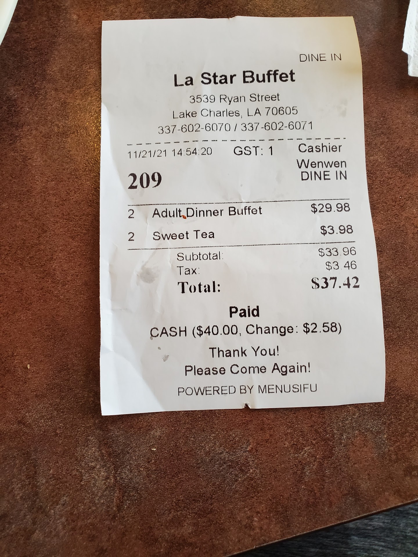 Ā Ā Ā Read moreLA Star ticks every box on the list of what a buffet restaurant ought to be.... actually, they go beyond that ! While they have some of the most delicious selections, they also have the kindest staff, an impeccably clean environment, and you can have just about anything your heart desires, in the way of sushi or hibachi meals ! The sushi bar is staffed with a sushi chef, who does a superb job ! The sushi is fresh, delicious & the presentation is lovely. Thereās also a hibachi area, also staffed with cooks, who will make whatever you desire, as you dictate it. Hot nā Sour Soup is my all time favorite food and I was thrilled to see a large pot of just that, at the buffet. The Hot nā Sour soup is actually the best Iāve ever had ! Iāve had a lot Hot nā Sour soup, from Colorado to Louisiana, & I thought Iād already sampled the ābestā, until we moved down here last year. This beats out any H nāS soup Iāve ever had... no exaggeration ! I recently picked up a takeout menu and discovered its quite cheap for a Lg takeout container of soup... I foresee a LOT of takeout, from LA Star, in my near future. Another big draw, for parents of little ones at least, is that the ice cream doesnāt come from a drippy old machine. They have a closed freezer with a variety of large containers of ice cream, side by side, that looks like something out of Baskin Robbins. It doesnāt look like a war zone in Candyland, as most ice cream stations in Buffet restaurants, typically do. The Wait staff are the sweetest !!!! Seriously, each interaction is such a joy. My last waitress was so sweet and paid special attention to my daughter, each time she came to our table. She even brought her an extra fortune cookie, after my daughter made sure everyone knew of her love of fortune cookies. The same waitress and I ended up in a funny back & forth, that I can onlcyc describe as a āCompliment-Offā; she has such a gracious demeanor, that she could not accept a compliment without giving one in return. LA Star, I beg of you... Please, donāt change a thing !!! We love everything about...