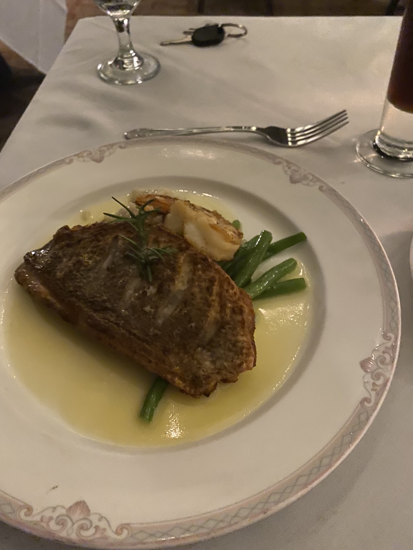 My entree was red snapper with lump crab and steamed potatoes. It also had capers in the sauce. The top of the snapper was so crispy it was like he fried it. I ran my fork across the top of it and could hear the crispyness. I love that the chef didn't put the sauce on top of the snapper and make it not as crisp lol. The steamed potatoes were not really my thing, as I discovered, but they were okay. My entree was good, although I like a touch more salt on the snapper for my tastes, which is a personal preference thing. My husband's halibut was amazing!