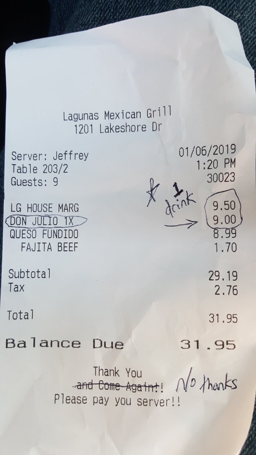 Read moreI just had my second and last time at this place, and what a shame being walking distance from our home. I not only just paid nearly 40$ incl. tip for an appetizer (that was half-melted shredded mexican cheese and fajita meat), but also the drink rang up wrong and cost 18.50 and the tequila was only supposed to be changed from house & upgraded instead to DJ. No big deal except the shot wasnt put on the side, individually, like my receipt shows it charged, and the margarita was not exceptional considering it was mixed with the House Tequila ruining the taste I wouldnt have minded paying for had it been how I desired. Food is very mediocre, salsa is strong on the tomatoes and cilantro, tortillas are seemingly store tortillas and not anything I couldnt just microwave up myself at home. I dont like enjoy public blasting of establishments but this place needs to figure it out. I spoke with a nice mgr who basically said sorry and that mgmt has her hands tied and I was not able to have anything changed from my bill. Customer isnt always right apparently here but I get it, my fault then. Our server Jeff was great but didn't get 20% bc he was not clear and let this play out after nodding in agreement after I ordered and mentioned I'm ok with an upcharge for upgraded tequila. I dont even know the tequila was added. Certainly not a $20 drink.