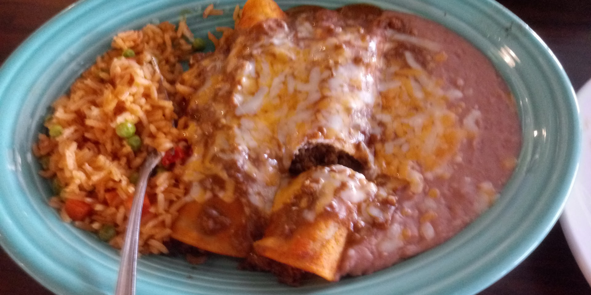 If I'm with my wife, when we go out for Mexican, sometimes she likes to share fajitas. But if I don't go that way, I usually get either tamales or beef enchiladas. This time I chose the beef enchiladas. It's a very simple dish. I also went with the lunch version, which is 2 instead of 3 enchiladas. That was a good decision too. Cause after eating half the nachos, I couldn't finish my main dish without hurting myself. I always worry that the smaller lunch portion at a restaurant may not be enough, but this was a perfect amount. Of course rice and refried beans on the sides of the enchiladas.