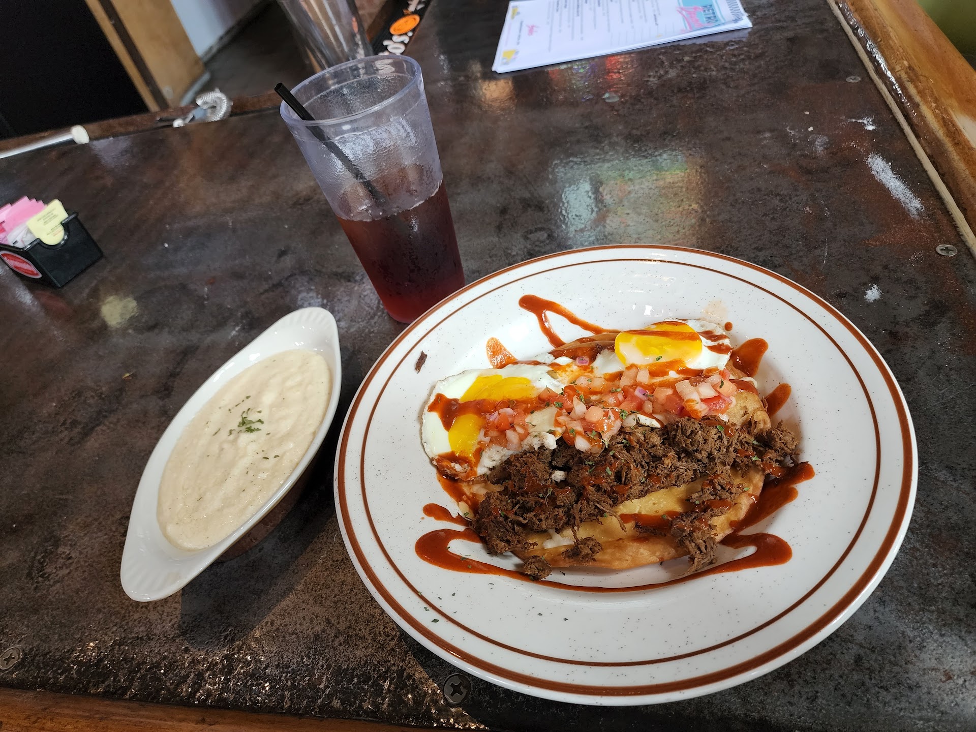 After looking at the menu, the Birria Huevos Rancheros seemed interesting. And it was! The meal came with shredded beef and a house spicy sauce that wasn't overwhelming. 2 over easy eggs sat on the side of the tortilla. I discovered a nice surprise with the tortilla being crispy instead of traditional soft.