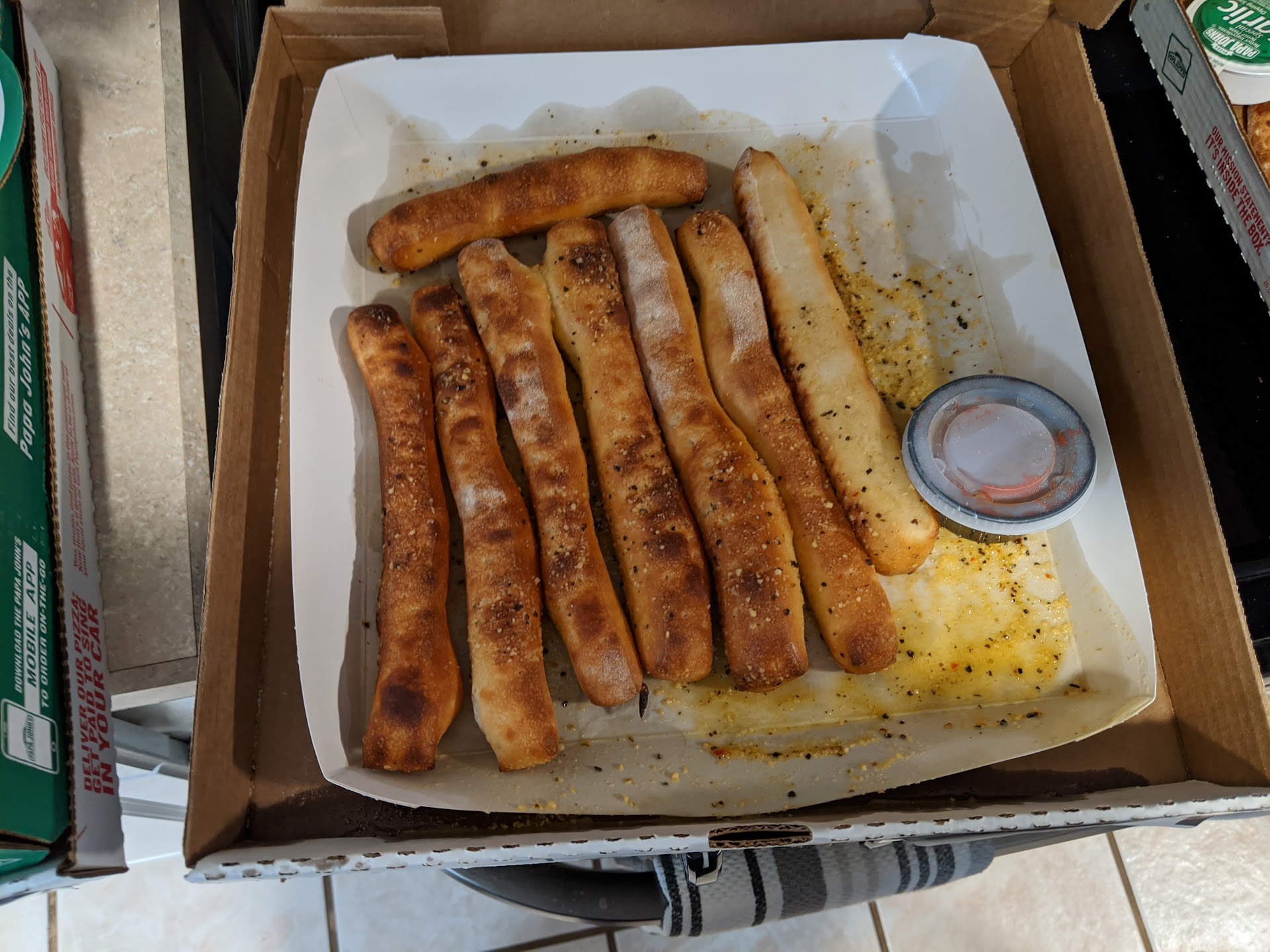 The food itself from the order was fine. The breadsticks they kind of dumped the garlic butter sauce into the box and it wasn't on the breadsticks. It could be that it just sat so long it...