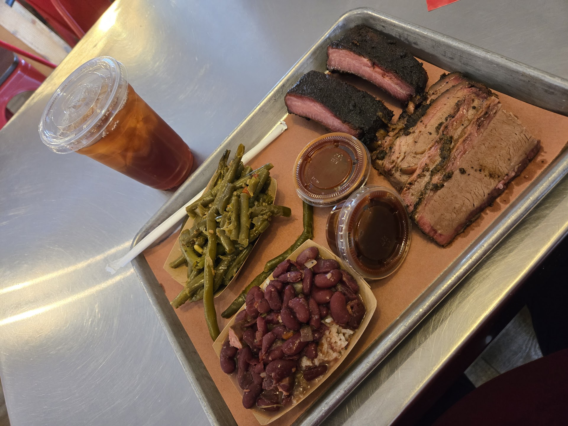 Im sad I forgot to take a picture because this was a beautiful meal. Ive been wanting to come here for a while and finally had the chance to today. The menu was very clear and easy to read. I got a brisket plate. the 1/4 lb was two slices so I went ahead and got 1/2 lb so id have left overs. I got two sides, green beans and smokey baked beans, and a drink. The sides were very good portions! My brisket plate (1/2 lb) with two sides, a drink, and a 10% tip was $27. The meat is sliced right in front of you and the sides are already prepared so its all dished out right in front of you with no wait time. The atmosphere was very nice. I was by myself so I sat towards the front near a window. The restaurant was very clean. The brisket and the BBQ sauce was amazing! The green beans had a very good flavor, they weren't my favorite but that doesn't mean they couldn't be someone else's favorite! I loved the smokey baked beans! I would have loved to see a cabbage, greens, or potato casserole on the menu as a side. I look forward to returning for more brisket in the future and to try different sides! There was a corn side that looked very good so I definitely want to try that! When I got done with my meal I did get a to go box to bring home my leftovers. I wasn't sure whether to leave my tray on the table but when I went to refill my drink I happened to see where to stack the tray and silverware so I followed suit! I look forward to...