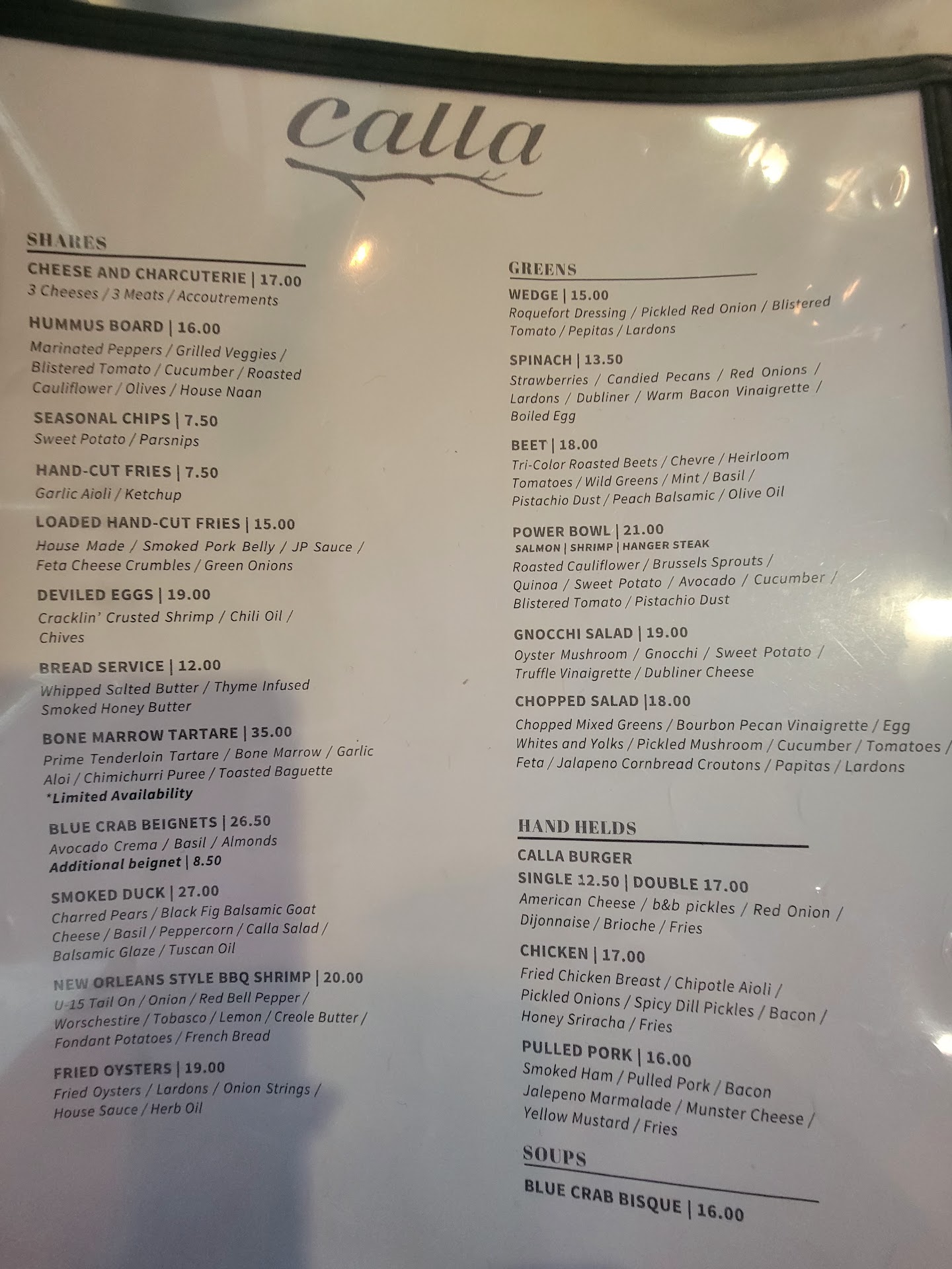Menu: appetizers included fries, bread, Deviled eggs, shrimp, chips, bone marrow tartare, blue crab Benedict, fried oysters, etc. which ranged $7.50-$35. Salads were about $13.50-$19. Burgers, chicken/pork sandwich $17. Entrees of lamb, steak, mushroom & truffle pasta, short ribs, fish, quail, shrimp & grits ranging $24-$63. Sides included asparagus, mac & cheese, Brussel sprouts, & veggies ranging $9.50-$11.50. The most expensive entree was a 14oz ribeye for $63; cheapest was 1 quail or the shrimp & grits for $24.