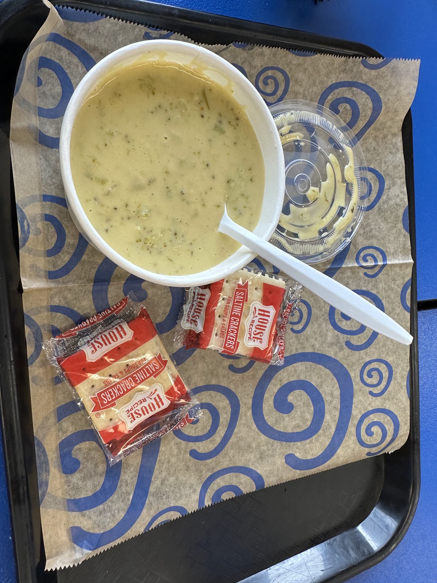 A lady brought two soups out to two customers who ordered after me. After one lady spoke up and said “I ordered mine to go”. She went to the back and they realized that should have gone to me. She came back out with it and apologized.