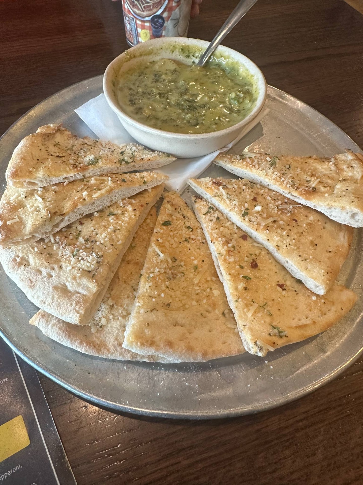 It's been years since I've been until a few weeks ago. It was AMAZING. So when my youngest child said she wanted noodles for her birthday dinner I said, I know exactly where I want to go. We arrived and was seated. The young waitress was new, you could tell, she doesn't have the confidence as a seasoned server. She got our drinks and we ordered cheese bread with half jalapeños-the kids wouldn't have eaten it if the entire thing had them on it. My husband ordered a draft dos xx and I ordered a lemon drop (they were both half off until 7). She came back and took our order. I ordered the muffaltta calzone an added jalapeños and roasted garlic, my husband ordered the angry pig pizza, my mother ordered the lasagna, one child ordered chicken strips with chips, and the other child ordered buttered noodles, and we added garlic parmesan bites. The waitress and the bartender checked on us. The food came out and everything was hot and fresh. The garlic parmesan bites were half off as well, so I wanted to try them. Some of them were hard, but I liked it. My Calzone was wonderful. My husband's pizza was AHHHHMAZING. He said, "this is one of my favorite pizzas I've had in forever." My little birthday girl loved her butter noodles. My oldest child did not like the chips served with her chicken strips, they were kettle style chips, I liked them. My mom's lasagna was PHENOMENAL. After the server came to our table I asked for boxes and our check. After ten minutes my husband went and found the bartender to check us out and get us boxes. The food was right at $100, which with 2 beers, a cocktail, 2 appetizers, 2 kids meals, and 3 adult meals, I wouldn't say that's terrible. I thought it was a great price. We will...