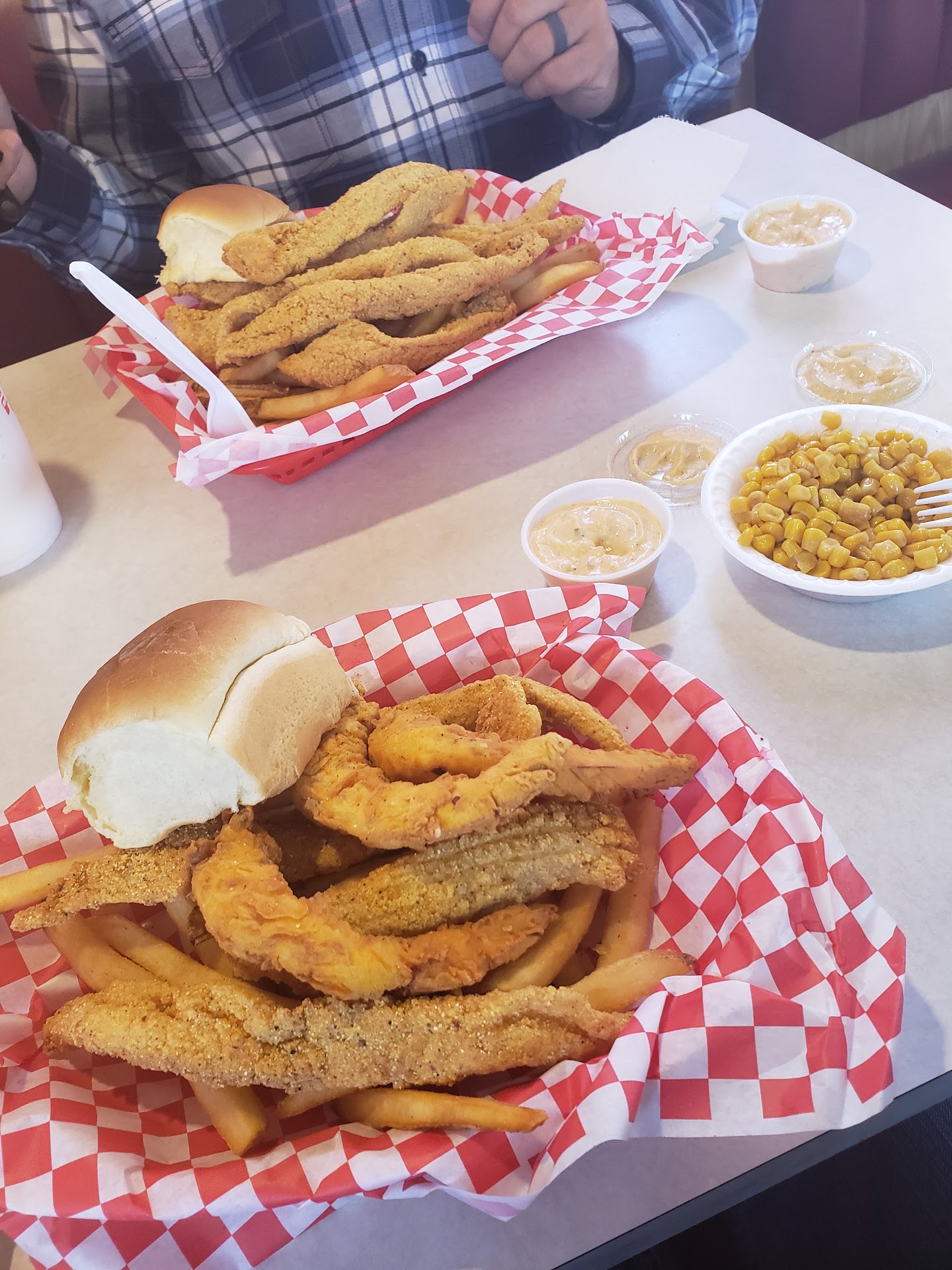 Food: fried & grilled fish, shrimp, chicken, oysters. Salads, burgers, poboys, hushpuppies, fried green tomatoes, coleslaw, red beans & rice, fries. I got the grille fish/shrimp combo with Coleslaw & green beans. My brother got the same except chicken instead of shrimp. We both agreed that our grilled items were too salty. The coleslaw was good. My husband & SIL got the fried fish with fries and okra. He felt the fish was underseasoned. The okra was okay. The fried sides/appetizers felt frozen-fried. I do love that you have the option to make the fried proteins grilled. Their portions are worth the price.