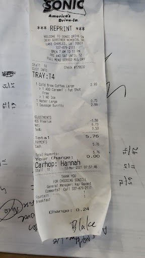 Read moreThis is the worst sonic I've been to so far and I usually love eating there. We had ordered a few things online and checked in. It took more than thirty minutes just for our order to go through after speaking with an employee. Then it took another 20 or so minutes for it to finally come out to us after we had spoken with a second employee. Some of the food was burnt and our orders weren't correct. I would've expected better especially since this sonic wasn't busy. They had maybe four customers at a time and it took almost an hour for us to finally get our order. I will probably never eat here again. Do...