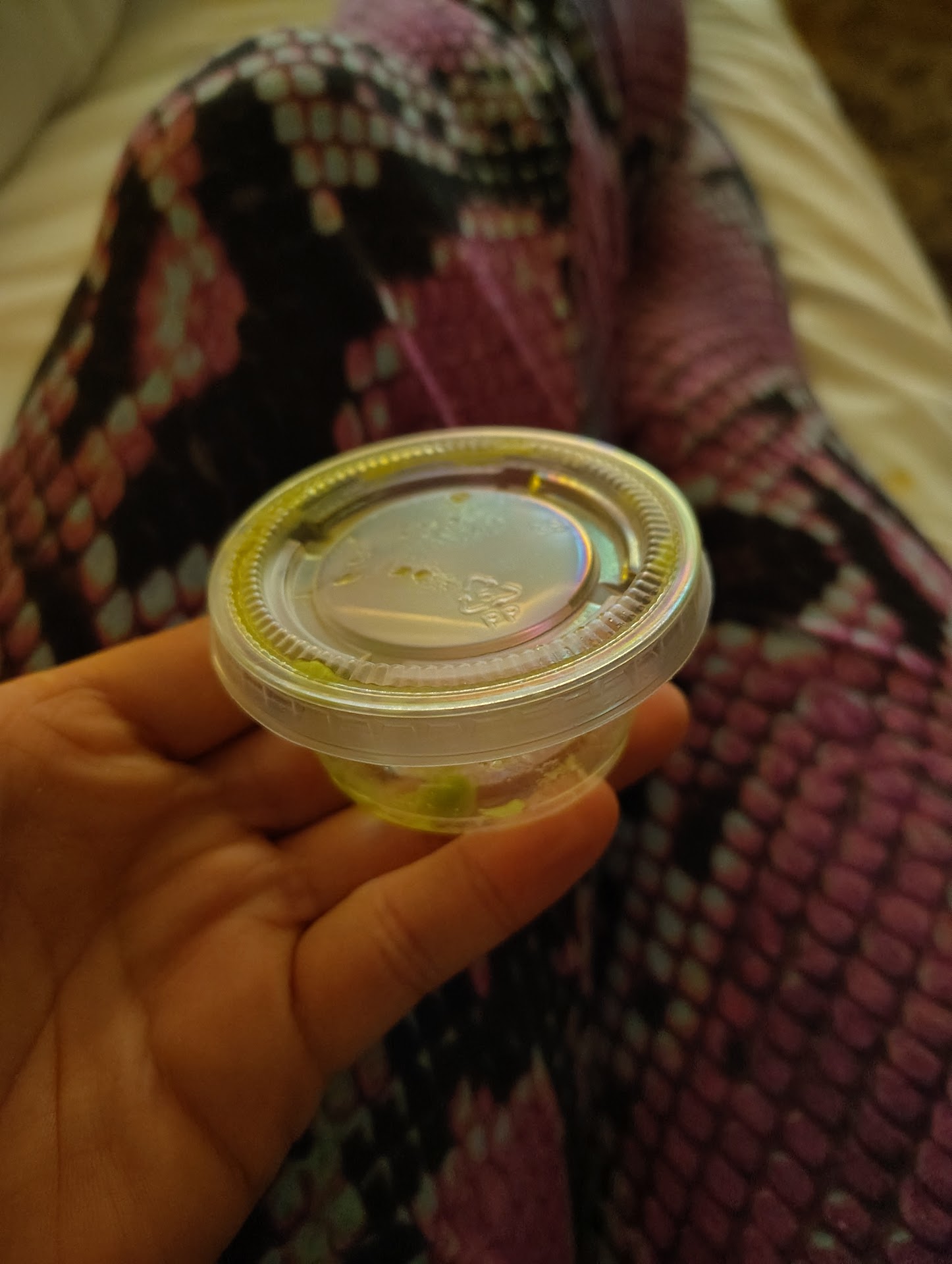 Posting a photo of the guac container. It says 2 oz on the bottom. I have tiny hands. This container was a little more than half full. The app shows a...