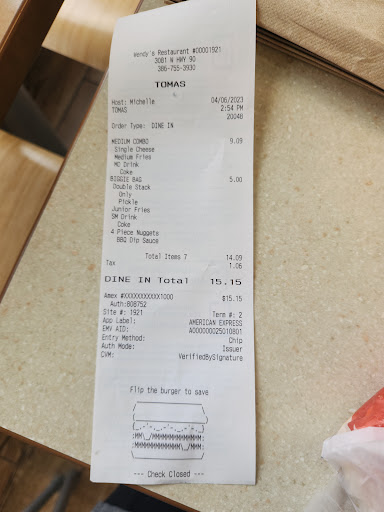 Read moreWent to wendys on us 90 and they need serious training. No toilet paper in stall, got two meals, 5.00 biggie bags. One no salt on fries,and no onion extra pickle on sandwich and had onion and salt on fries, other sandwich had barely dab of ketchup, no BBQ in either bags for nuggets and food was barely Luke warm. Brought sandwich back up to counter and instead I'm apologize we will Mke another I get attitude and says well u can't just take onion off. ( what if I was allergic and thT taste still on there). Another person brought in there sandwich the whole sandwich inside in out had ketchup all over it. Group of people standing outside going through there food as we was leaving. There food wrong. Cashier had attitude and was mouthy and didn't know when to shut her mouth. Cashier to busy being lazy laying on counter and not stocking nothing and had to have a customer tell her that they need to put out wet floor signs. Floor was soaked on one side. Shouldn't have to tell that to an employee if there was a decent manager there that did training. I have never been a manager before and could do a better job. A bunch of lazy people including the manager there. Customer service for that one is a negative 1000. U as a huge company should be looking into this cause it's giving u all a bad name and it's just not me...