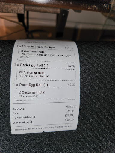 Did not eat so I can't be harsh on the atmosphere. Service I called and asked does the Tripple Hibachi come with rice vegetable and yum yum sauce. She stated yes . So Told her my name and told her I would be ordering through Uber. FFWD delivery came no yum yum sauce Cleary requested 3 and spoke with someone at the restaurant and gave her the request. My whole point of getting Hibachi for the Rice Veggies and sauce so to get no sauce was a disappointment. Wouldn't recommend online or uber.Uber. clearly a phone call reminder and receipt notes do not help. Reading is fundamental! Refund...