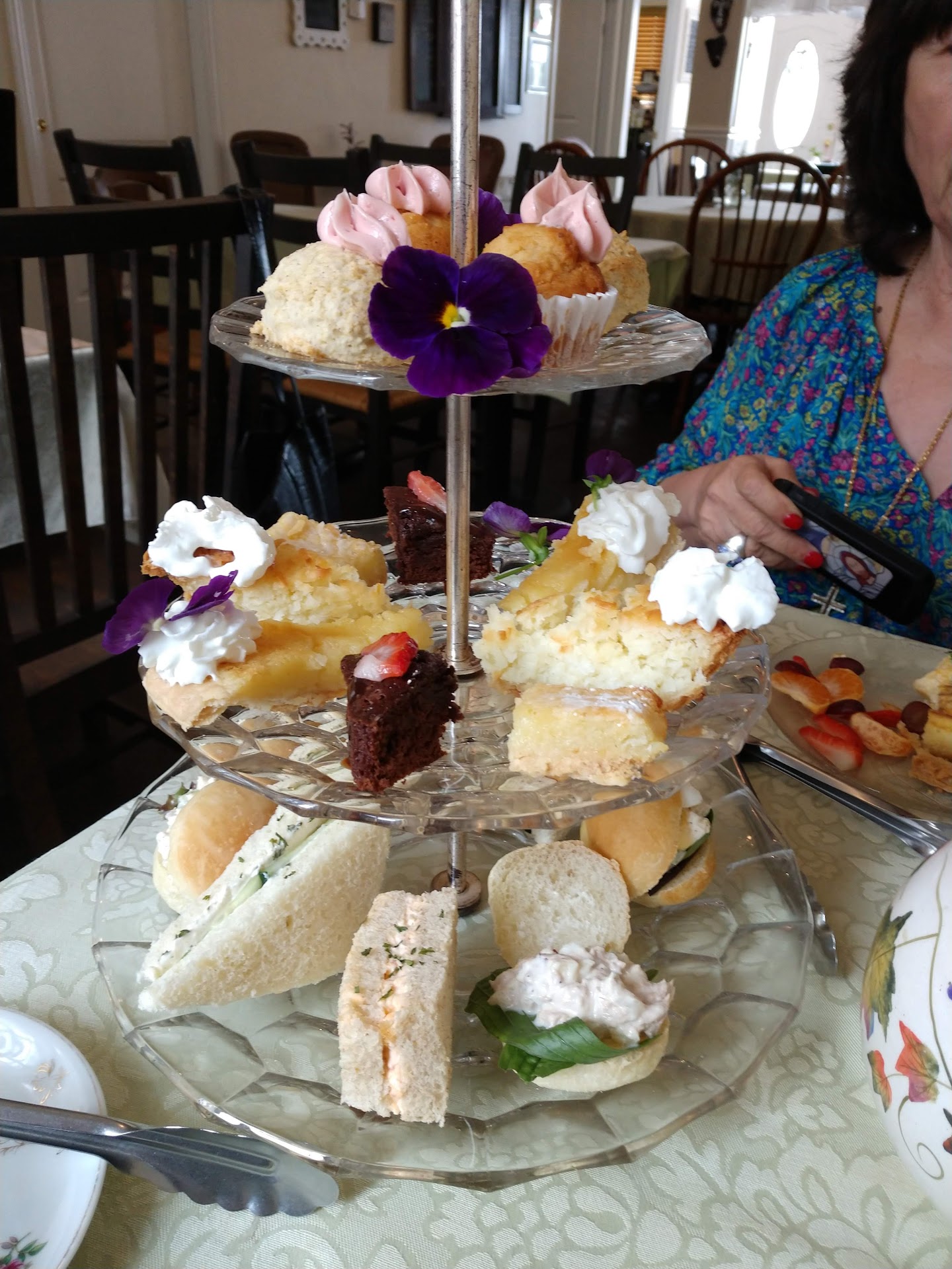 Read moreI went to lunch here with a friend yesterday. The place is cheerful and airy. Quiet, pleasant music played in the background. We were quickly greeted by a friendly server and given a cozy table near a window. The service was prompt, helpful and friendly. We both enjoyed pots of tea. I really like that they serve everything with real crockery and that it's all unique and pretty. I had the sample platter which included chicken salad, chickens and rice soup, quiche, a mini scone and fruit. It was all tasty and fresh. We both had cobbler for dessert, which was also good. I enjoyed the happy, relaxed atmosphere. We visited for a couple of hours and never felt rushed. The server was always cheerful and helpful. I look forward to going back and having one of their 'teas' with a friend. All their goodies looked yummy. The mini scone was...