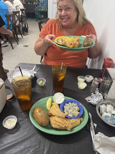 Atmosphere - very small space with big tables so it felt crowded with only about 10-12 patrons inside. Service - our server was very very nice but did not know much about the food prep. I asked about the potato salad and all she had to say was she'd had no complaints (๐ being day 1, I guess that was true). Food - was not bad and has potential once they all get in the groove of things. I was disappointed that baked potatoes aren't served until 5pm and I didnt recall seeing that on the menu. The potato salad was bland and potatoes slightly undercooked; most of the potatoes in mine were too firm. The fish is good but would have been much better if they had been fried about 2-3 minutes longer. They steamed on the plate so the crispness was lost to the very lightly fried crust. The coleslaw tasted good but overdressed so it was goopy. The best thing .. the hushpuppies that are supposed to come with the meal, but we had to ask for them. And no sweet tea. ๐ This is Texas. Sweet tea is a must. We may go back once they've had a chance to practice the food prep because they do need that opportunity. I guess in remembrance of the Duck Inn years ago, we were somewhat...