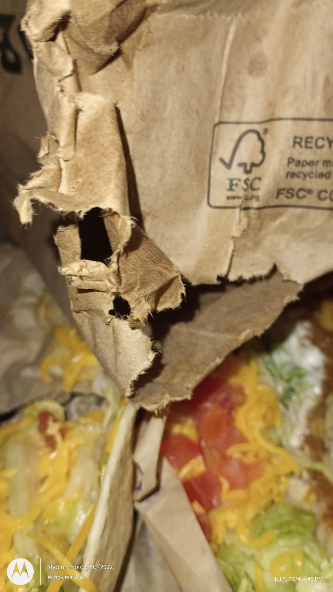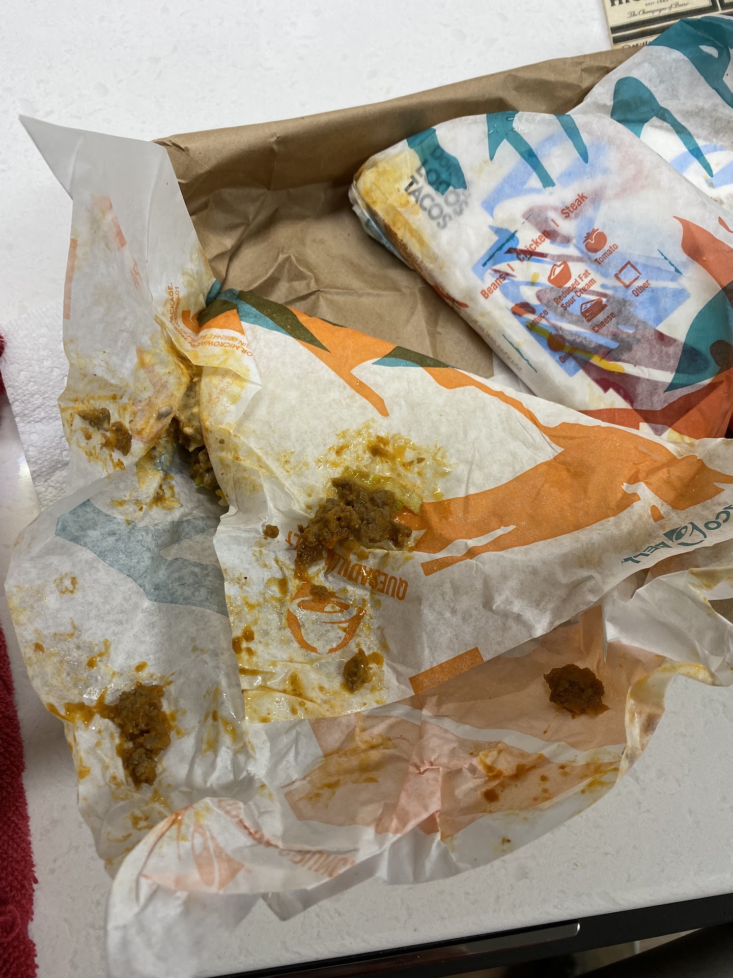 Read moreStopped in to get late lunch for the wife and kids to bring home. Initially, customer service was ok. Did note floor and counter sticky, dried soda or unclean mop, whatever. Not a bother to me. Order process went well. I am naturally a calm person, let things slip. I got to the soda fountain, got Pepsi. Noted the color was clearish. Tasted and yes, the syrup was low. Filled with cherry Pepsi then. My name was then called and I was told "here's your food, thank you." I doubted the accuracy immediately as I had ordered $37 in food and there was two items in one bag. Total. I stated that I was missing other things including a Taco twelve pack. They grabbed the bag and took it in back. After more time, they arrived with the Taco twelve pack and the original bag again stating "sorry about that, here's your food, have a good day". I opened up the twelve pack, looked good. I opened up the bag, missing cheese roll ups and soft taco for the #7 meal. Had to holler to get someone's attention. When I finally did, stated still missing items. They went back, made three cheese roll ups and delivered to the bag, stating, "sorry, it's just one of those days". I gave up on getting the order completed after three times and proceeded to leave, missing the soft taco. After going through the first set of doors, the twelve pack box burst open on the floor spilling all tacos on the ground. I walked in and heard one person snickering and another just staring at the ground of tacos. I had to ask for a bag so I could get my food off the floor to take home what hadn't been soiled. Zero remorse from any employee. Lack of help....