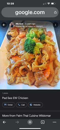 Read moreSo, on a whim, I stopped to pick up something for dinner. Costco was closed, so no hotdog! I’m glad Costco was closed, because Palm Thai Cuisine did a lovely job with the 2 dishes I ordered. The 1st dish was Chicken Penang. 2nd dish was Mixed Vegetables. The Penang was great, sweet, savory, and just the right amount of heat. I am not a fan of super spicy foods, and so I generally order Thai food with 1 or 2 level spicy. I’m a wimp!, but I’m sure they can oblige anyone who wants to breathe fire! My Food was fresh, with the Mixed Vegetables, cooked just right, not mushy or too hard! The veggie dish is pretty simple, I think it comes with choice of meat. I had Chicken. The sauce they use was a nice complement of sweet vinegar, soy sauce, a hint of garlic and ginger.