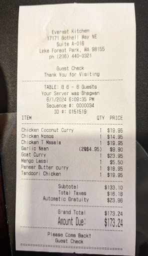 We are now planning our 3rd dinner there to meet family members, who just stopped by briefly to pick up a key while we were dining on Christmas Eve night. Just by the smells alone, they will be eating at the Everest Kitchen soon—with or without us. But once again, we will be driving up from south of SeaTac airport just to eat...