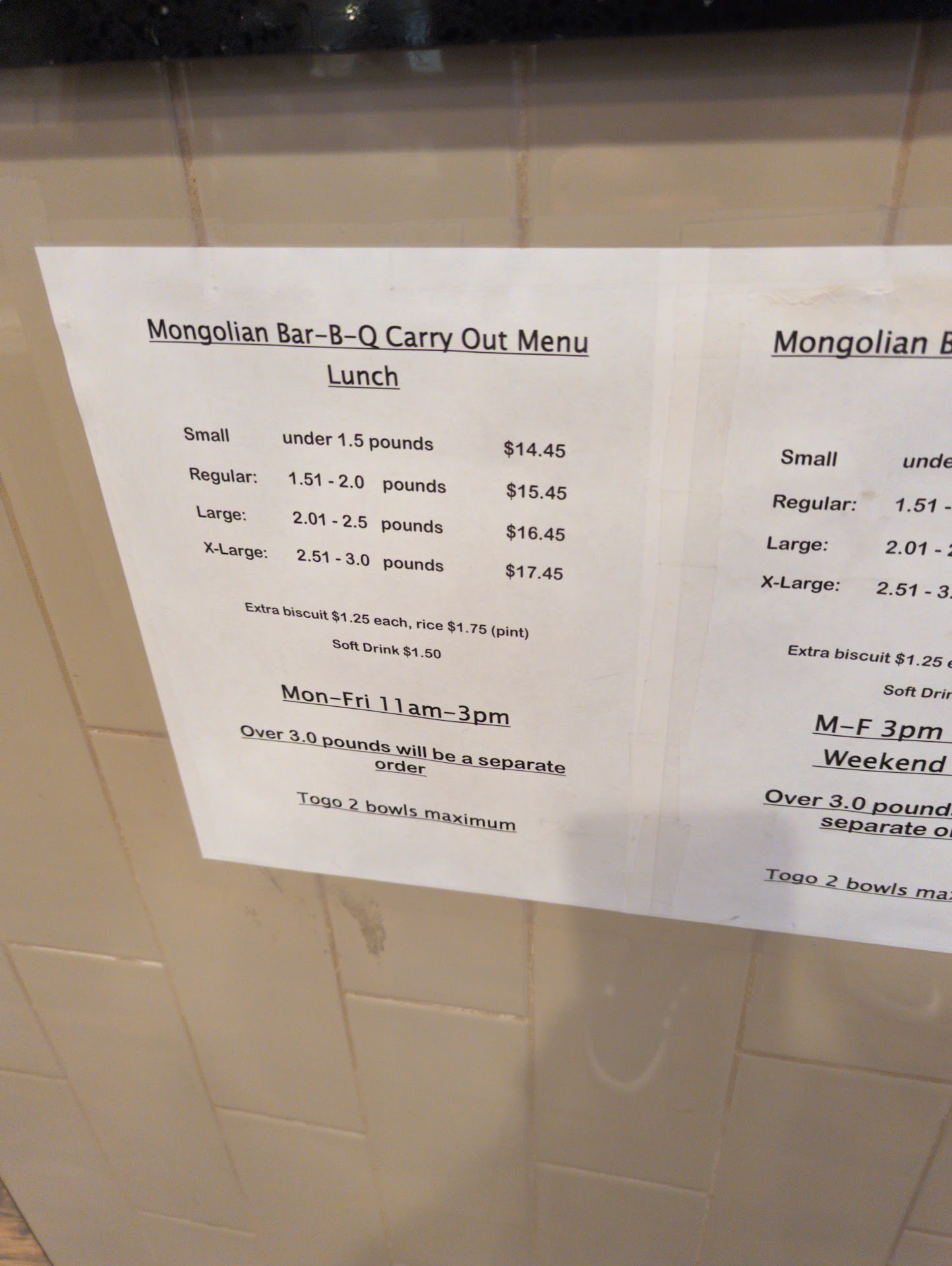 All you can eat Mongolian BBQ in a clean and well staffed restaurant that is large and has plenty of seating. There are lots of choices with regards to the protein including chicken, pork, beef (the standards) plus lamb, shrimp and crab. In the veggie section they also have the standard celery, sprouts, mushrooms, carrots, broccoli, cabbage, bell peppers and such but they also have some items that are not typical for Mongolian BBQ places that I have visited. Items such as corn, peas, zucchini, pineapple, jalapenos, spinach, tofu, and others. There is a topping station that has 9 different flavors to suit any taste exploring, they include oil, garlic, lemon water, spicy hot sauce, curry, sweet chili sauce and a couple of others. This is a fixed price meal and you can make a second bowl if you want to try variations. Not sure why people were not happy with the service as we were seated immediately and were grabbing gloves and bowls within minutes of landing. I did have to ask for white rice, however she did not charge for it saying it was included as well as the sesame seed bread that was brought to our table. If you like to eat hot food,. customized to your own taste and want it fast without any chopping, heating up a pan or making a mess, this is the way to go. I posted pics of the menu and the cost does vary from lunch to dinner. Take out is done by the pound and delivery is not something that meshes well with this type of restaurant. As with most All You can eat, it does not allow take home food, which is a bummer since I paid for it and could not finish it but I understand they would be out of business with people going up twice to get a second or third bowl to go. Still, other places have let me take home my leftovers if I only went up once. They could do that here as well and it would be great. I was sad to have left anything as I made a great combo today that I would have taken home if it were not all you can eat. Just saying, they should consider two options - like sushi places, you either buy the all you can eat option with no take home or a single bowl and a doggie bag to go. The place is about $20 a head. Just go with it and tip the cooks, they do a good job and...