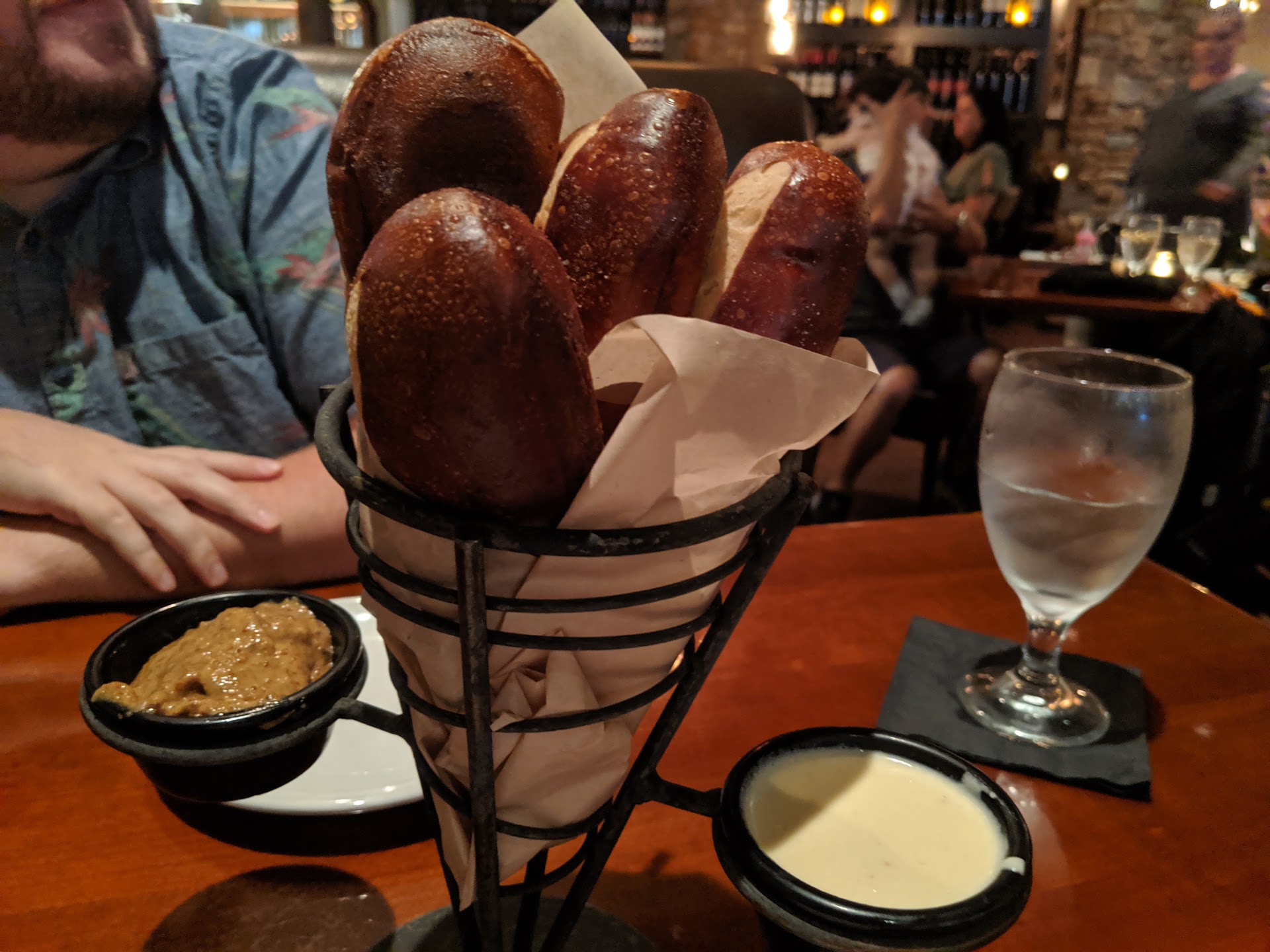 First up, the appetizers brü and crü. Described as pretzel bites with cheese dip and a mustard fig dip. I give it a 1 out of 5. The mustard fig dip does not factor into this rating, because I hate mustard, so my opinion is biased in that area. The pretzels were more like bread stick loaves, cut diagonally long wise. They didn't have the pretzel taste to them. The cheese was surprisingly lacking in all departments. It tasted bland with no taste. My boyfriend, who also dislikes mustard, was okay with the mustard fig dip, but preferred the cheese.
