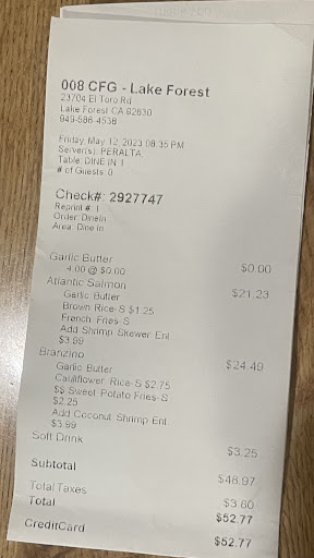 Read moreMy family has been a customer for a long time. Especially at Foothill ranch location. We love the food and the service. Everything was excellent. For who knows what reason they decided to close this restaurant. Today I first time came to El Toro location and was very disappointed. The coupon they send was not accepted because it is have to be printed. But it is nothing about it on the coupon. The general manager was not there anybody now why and the guy name Luis was absolutely no help. Staying with this smile which already gave you expression he will not give a damn about all what happens Next they bring my order for take out on the plates it should be for inside. To fix mistake they just simply put all food in boxes and of course when i came home everything was cold. Salad with already dressing in it was not possible to eat and they forgot to put sauce on fish which is smells like dirty grill Never again I will order from El Toro location. And because we don't have any more anything else close to our home is mean we have to say goodbye to...
