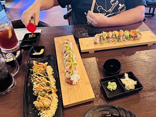 Me and my friends were hungry and we wanted to beat the traffic so we decided to eat early dinner and then go on the road. This place looked good and we love sushi so we decided to go to your place. There was a line up and we were told very clearly that things may get delayed to get seated inside. One good thing I want to say about the waitress is that she was very good with her communication, explained how much time it will take, how to order etc. We were lucky that we got seated shortly. The menu was shared and explained what's on the menu then one needs to mark the order form. The waitress came in no time validated by reading it loud. We didn't have to wait long and the appetizers such as edamame with garlic, and chicken karaga, while we were enjoying the drinks we relied on water which was served at the first place with the menu. We ordered non rice sushi which is more protein and less carbs. We had cucumber sushi, yellowtail sushi, and keto sushi. It was delicious and we really enjoyed having conversations and enjoying the sushi dinner. The customer service is great and I will give 5 stars to the waitress and her service. The ambience has a positive vibes and customers move in and move out smoothly. They do have a clean restroom but it's one person at a time so be...