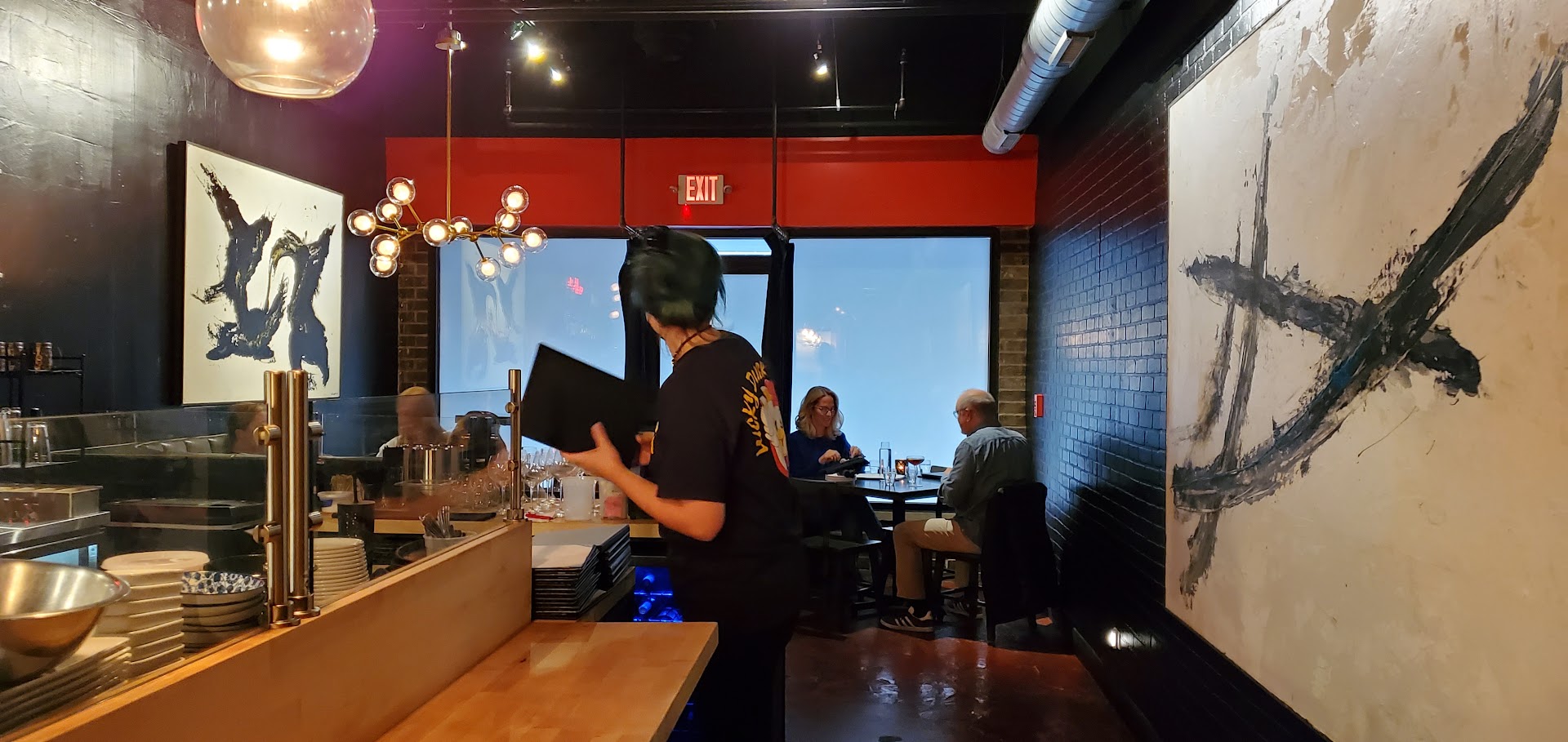 The black painted walls engulf rather than engage. The chime when the front door opens sounds like a dry cleaner rather than a dining experience. And the contrasting party room is wide open to the restaurant side, not quite a yin yang.