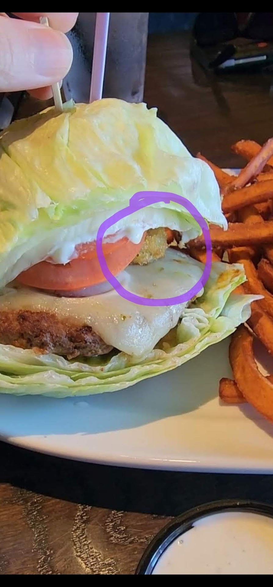 My burger came with a purple allergy pick in it. As I was eating, I noticed something scratchy. Deep fried jalapeño coins. Gluten is anything with wheat, barley, rye or cooked in a shared fryer with those things. I even went back and looked at a video clip I filmed of my burger and noticed in one part I could see a fried jalapeño coin with the allergy pick. I'll include the screenshot. I wish I had noticed that before I ate it!