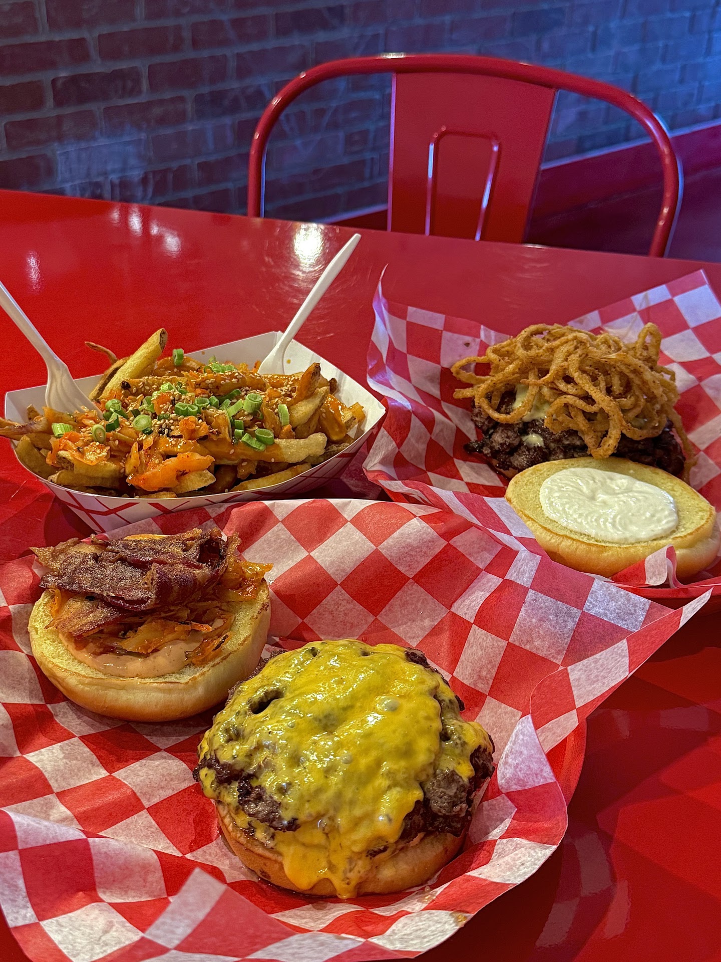 Read moreThe food doesn't come out all together but overall the shaolin burger was good. The Korean Hot Chicken sandwich breading fell right off the chicken breast, so that wasn't ideal. The kimchi wasn't good either and was just overpowering, finding no balance. The floors were sticky and the pop machine is near stairs so you feel like you're going to fall backwards when you are done grabbing your drink. After we got our first half of the food, they took our number without asking if we had any more food. I told the man we were waiting on more food, but he still took the number token with him. We got our basket of fries when we were done eating our burgers. One time eating here is enough for us. This place has potential, just needs to tighten a few screws...