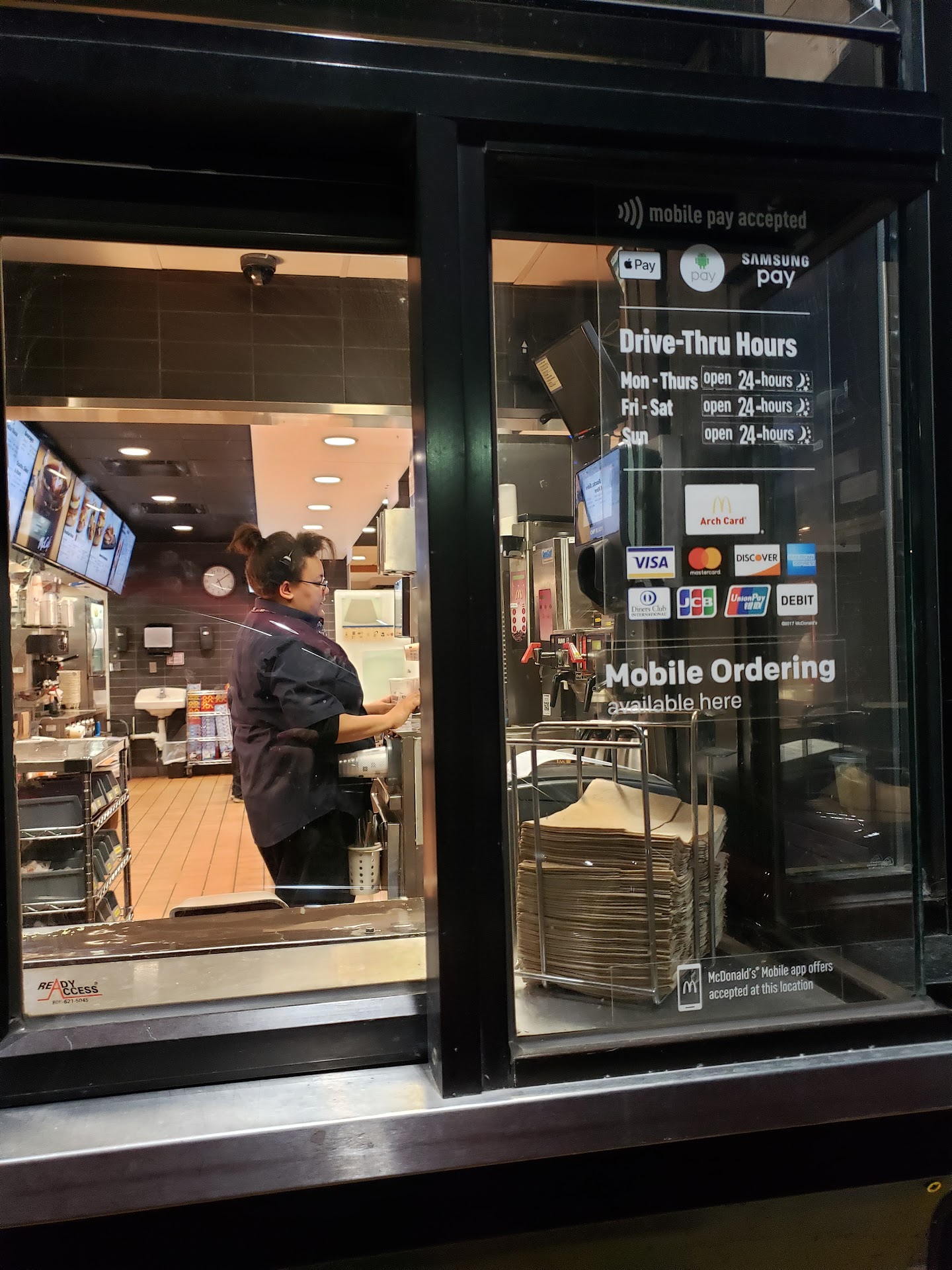 Came in tonight to eat a quick dinner with my family. There was a group of originally 3, but eventually 5 kids, running around the restaurant and acting like a group of wild animals. It’s McDonald’s, fine, they’re kids, let them be kids. It wasn’t even an issue…. UNTIL they started being rude to my 8 year old Daughter and then began running around yelling and swearing, throwing cups around the dining room, going behind the counter where the employees are, and then STOOD AND WALKED ON THE TABLES!! The manager did ask them to get away from the counter, to which they replied “my grandma works here”. The employee working the counter was clearly stressed, manager looked like he was at a loss, and we were annoyed and ended up just leaving. I understand this is not ALL of the employees faults, and I honestly feel bad for them that they even have to deal with anyone acting this way…. HOWEVER, what a horrible experience. I’m not understanding why this was allowed. If Grandma had to watch the grandkids, it should be at home if the kids can’t learn to respect your place of work and behave. I’d rather wait 30 mins for a burger because they’re short staffed for the night, than EVER experience that again. Manager should have took charge of the situation and let the grandma know that someone had to pick up the kids or she had to go home. I’ve been in a few situations before where I had no other option than to bring my child to work, I get that, but if my child ever acted half that bad, I would expect to be sent home and told my child couldn’t come back with me. I’ll stay away from this location if I come in and those kids are there. My child shouldn’t be made to feel uncomfortable by an employees family members of all people, while we’re just trying to have a quick bite to eat. Never mind the fact that their behavior was disgusting and just down right disturbing. Short staffed or not, that was...