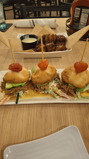 Went in just before the dinner hour and were greeted and seated right away! Jacob was the server and did a great job with all aspects of service! We had different cocktails a hard seltzer, beer and a couple of the drinks of the month which were a gin base mojito type drink. Not recommended!! By the drinkers đ. For the meal there a street taco plate with a side ( Onion Rings were the choice) tacos were just ok nothing special rings were straight out of the Ore-Ida bags. A plate of ceviche tostada stack were shared and this was made by someone who has no idea what ceviche is, not flavor bland with a salsa that matches. I had the Rebel Burger it was good choice meat had flavor toppings fresh all around good choice fries could be better. Over all liked their service the food just average! Lots of tvâs everywhere and clean and...