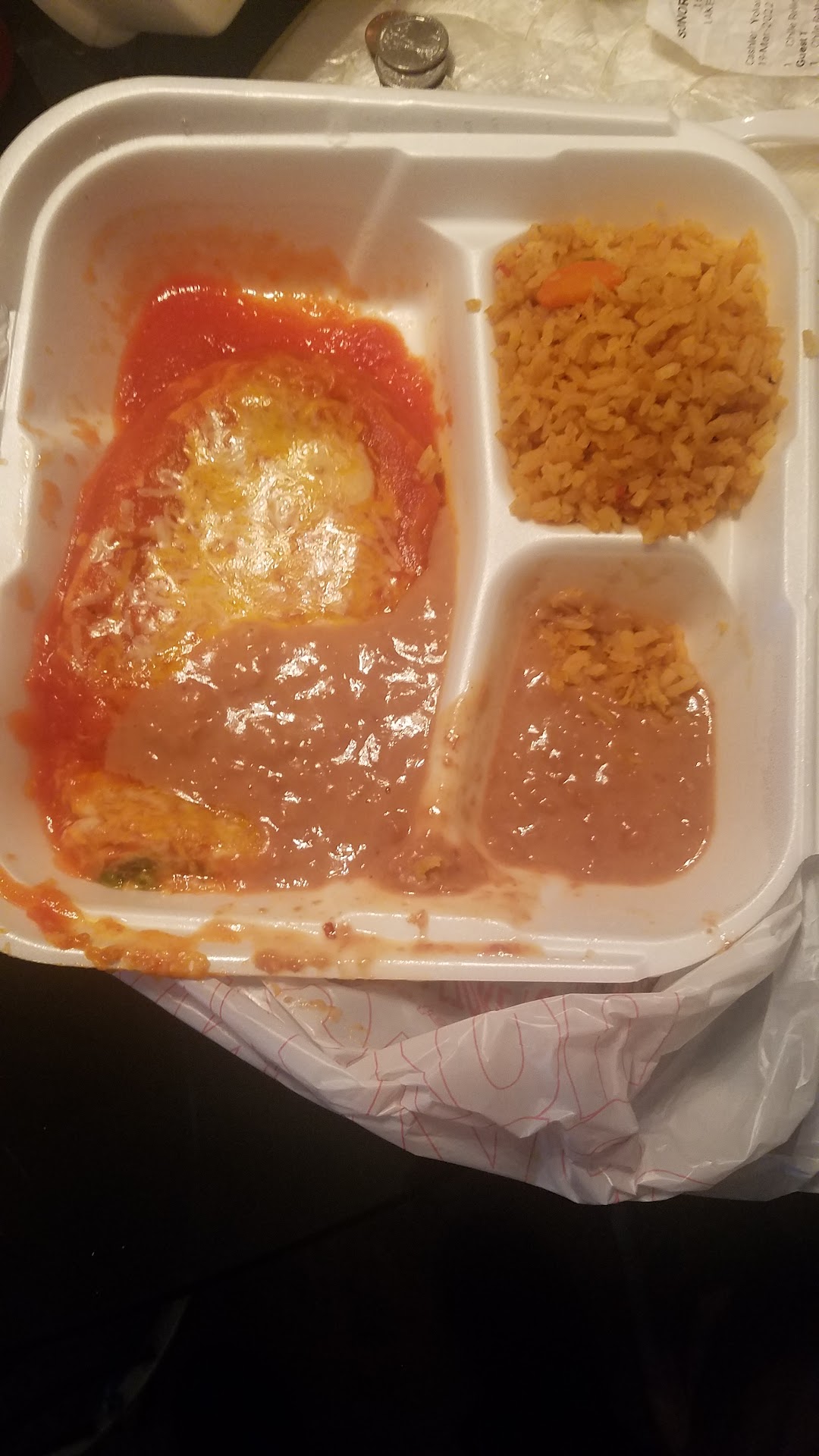 Read moreWorst and most expensive Mexi in town. Bought a combo and an ala cart chile relleno, literally two rellenos with rice and beans totaled almost thirty bucks (26 something) and this is what you get. Disgusting looking food with runny beans all over the relleno and barely any rice and beans for one person. What exactly was the point in giving out tortillas? You couldn't possibly make anything from these plates. Staff was lousy, broken English and mad when you can't understand her. Clowns inside couldn't tell me where to pick up my food and they couldn't break a fifty.