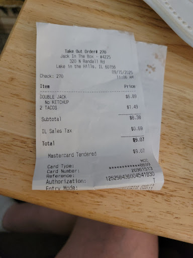 Read moreWe drove almost an hour to this location (closest one to where we live) . Seeing that they opened over a month ago we were very disappointed when we arrived to a 40 min drive thru line and no dine in! If you go to the Jack in the Box website to see the menu for this location, Lake in the Hills doesn't show up. If you Google this specific location and go to their website, the menu still doesn't work. You can see different categories, but when you click on the category nothing happens. There was a person taking orders from each car, but he was nowhere near the menu board. We didn't know exactly what we wanted since we had planned on dining inside. The guy handed us a menu card that was barely readable and unless we could pick what we wanted in about a min, we were told we could go out of line and come back which would have made the long wait even longer. We had already been waiting in the lineup a while at this point so we threw together an order. When we finally reached the pick up window, we were offered 1 cup of water instead of the three we asked for. There were clearly three of us in the car. We were told they're supposed to charge for water! We were not told that by the person we gave our order to. We were given three waters, but we saw someone walk out to the guy taking orders and wondered if he was being corrected. Charging for water is in very poor taste, especially after making people wait that long in a drive thru line! After we got our order we ate in our car in the parking lot since we weren't driving an hour home with the food. It wasn't until we started pulling food out of the bag that we realized we weren't given any napkins. The tacos we remember come with sauce on them. These did not, which wouldn't be an issue, but we we weren't offered any nor were we offered ketchup for the other food. I don't know how they're going to last if they are this slow and unorganized after a full month. It'll be a while before we decide to go back any time soon.