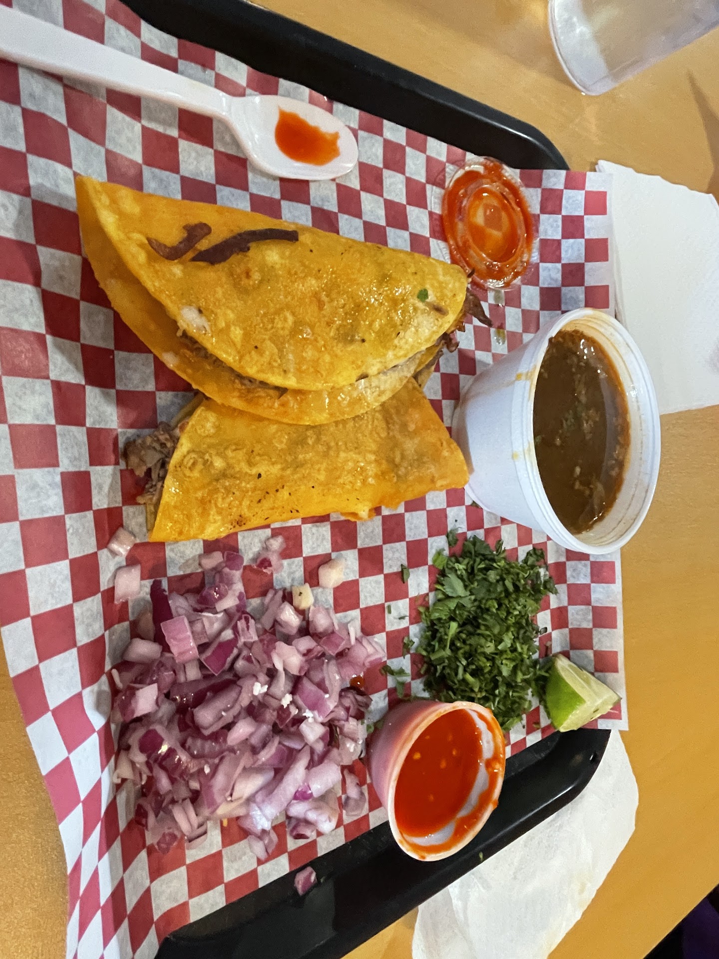 Oh my TacosBirria!! Every single visit has been 100% spot on. The chips are flour not corn, makes them thicker to dip that amazing verde salsa. Typically the green doesn’t pack a punch- but theirs does! And it is everything you want a salsa to be! Do not miss out- you’ll have to pay for those chips and salsa but you won’t be sorry. Follow it with the Tacos Birria. A taste sensation with slow roasted meat, white cheese in a fried shell. Served with red hot sauce, fresh minced onion, and fresh cilantro, and lime. One cannot miss the cup of hot consume served on the tray! Dip the taco or sip the consume like a soup… but don’t leave anything in the cup!!