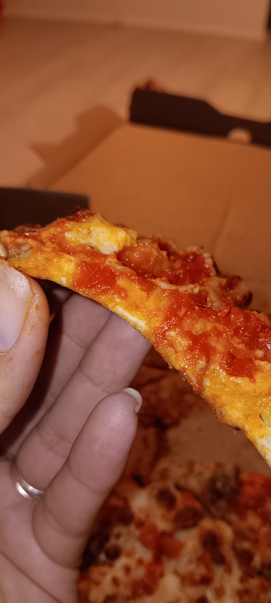 But the hour I waited I witnessed a lot. Employees wiping their eyes, face, arms and then going to make everyone’s pizzas. The lady with the wrist brace probably rubbed her nose before every pizza she topped. The sanitation I witness was nonexistent. I saw people dropping things on the ground and then putting them back on the dressing areas, while they all joked around. I was pissed and annoyed and very disappointed. This was a reminder why I never go to papa John’s. I’ll stick with dominos or Pizza Hut...