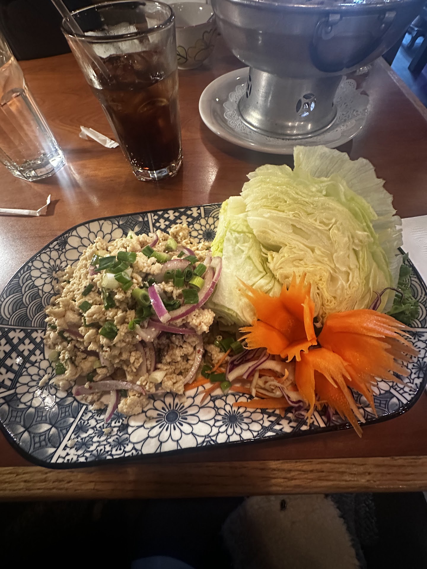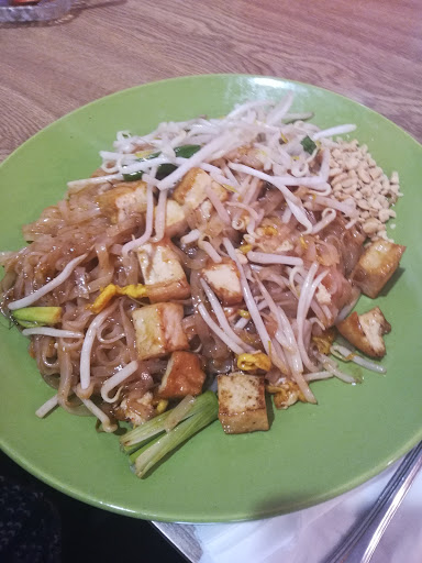 The pad thai isn't spicy to me (which is a good thing) and I beleive the nuts are peanuts. The spring onions were a little under done. The noodles weren't overdone but they also didn't have exactly any bounce. All together a great...
