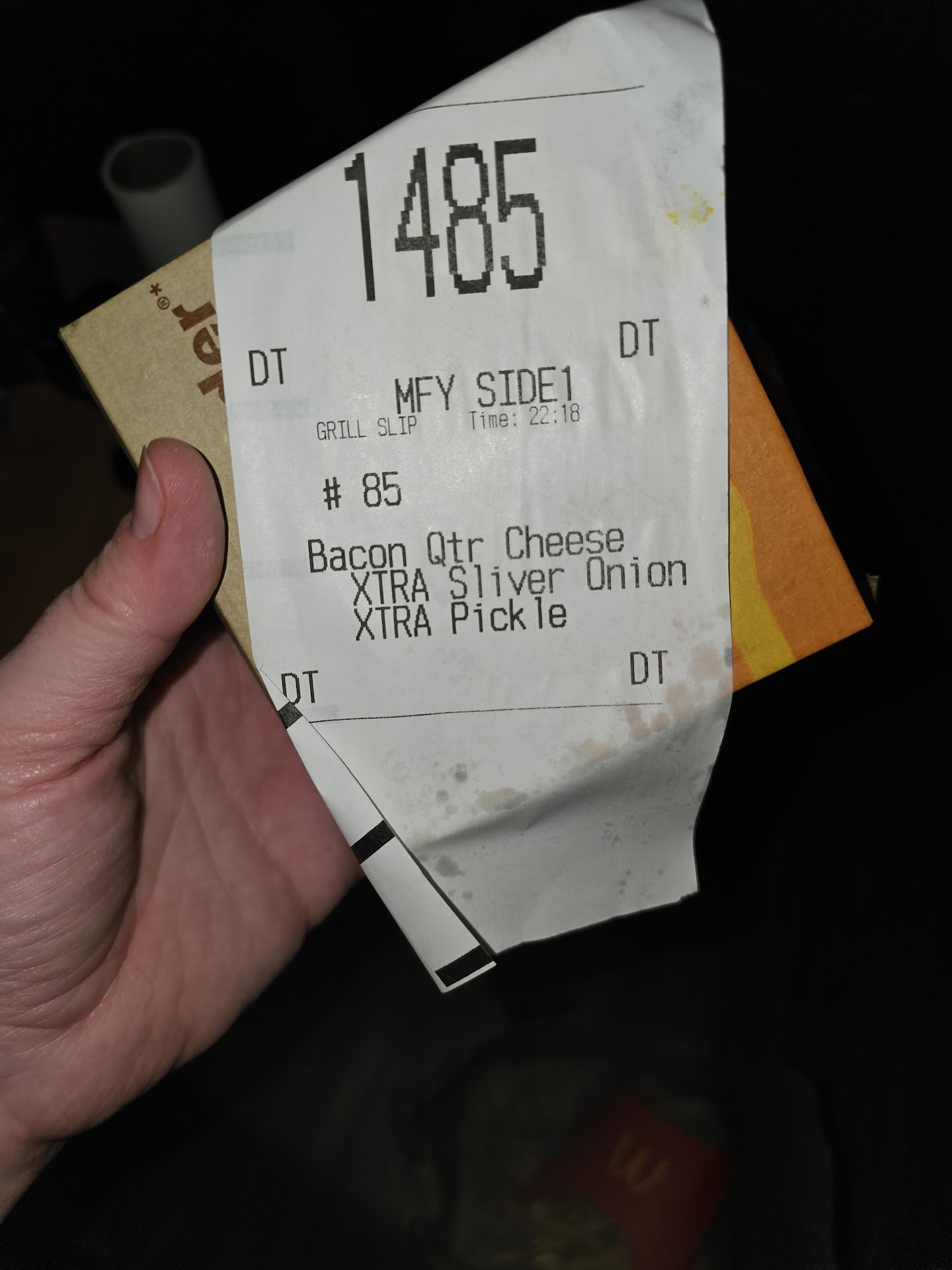 I was too tired to cook after a long shift at work tonight, so I came here again and ordered my usual: a 2b (BACON QP), a pie, and an unsweet iced tea. Tonight, for the third time in the last month, ALL of my food was stone cold! The pie was cold but somehow still had raw dough in the crust, the entire burger was cold and SWIMMING in a pool of grease (which was so cold this time that it actually congealed and turned white in the corner of the box), and my fries were so cold they were almost rubbery. To top it all off, my burger had NO BACON on it for the third time in a row, even though my box literally said "BACON QTR CHEESE"!